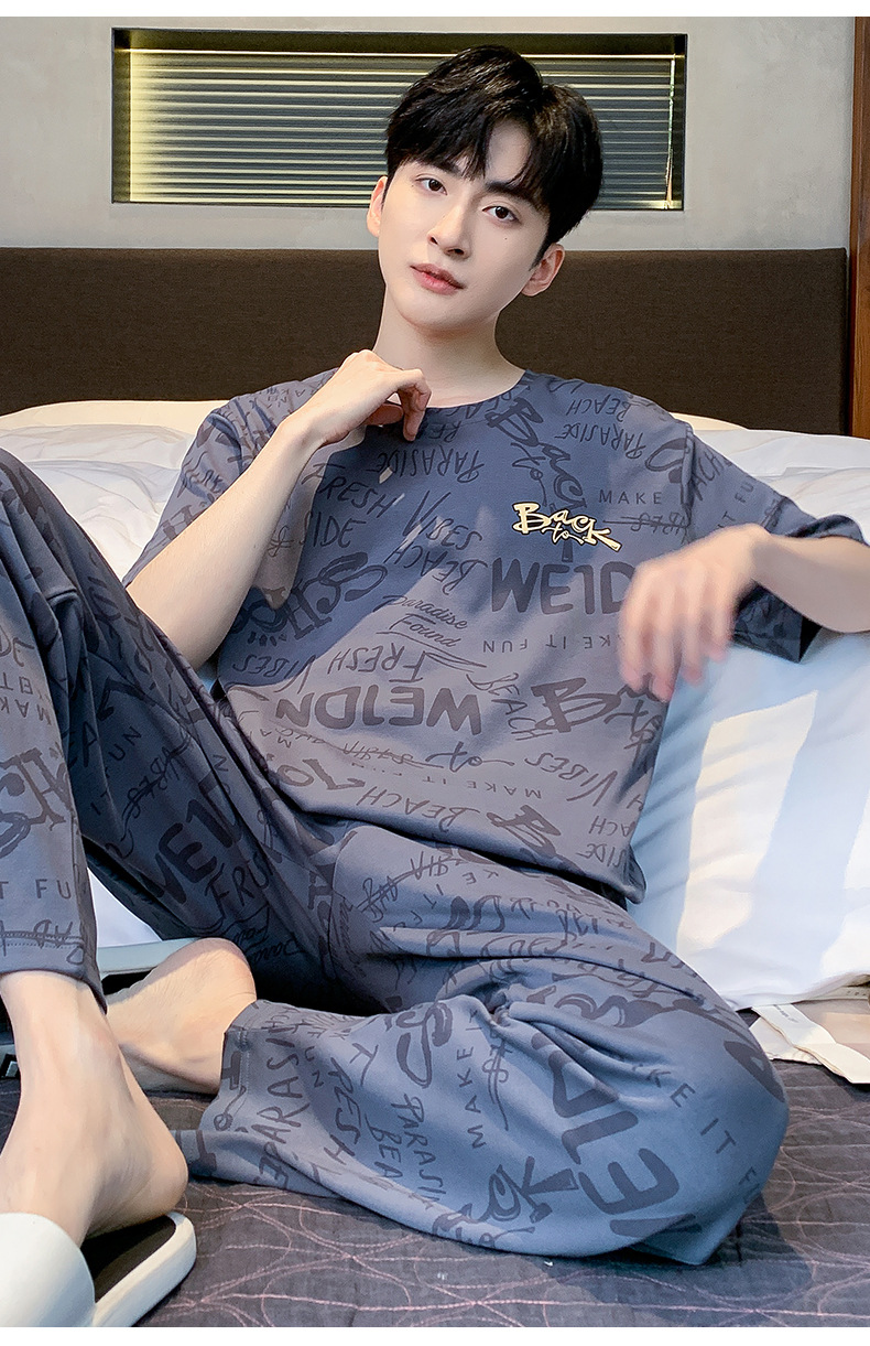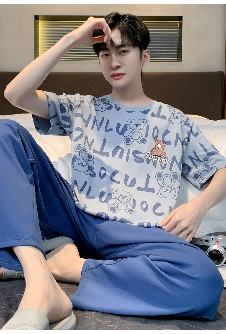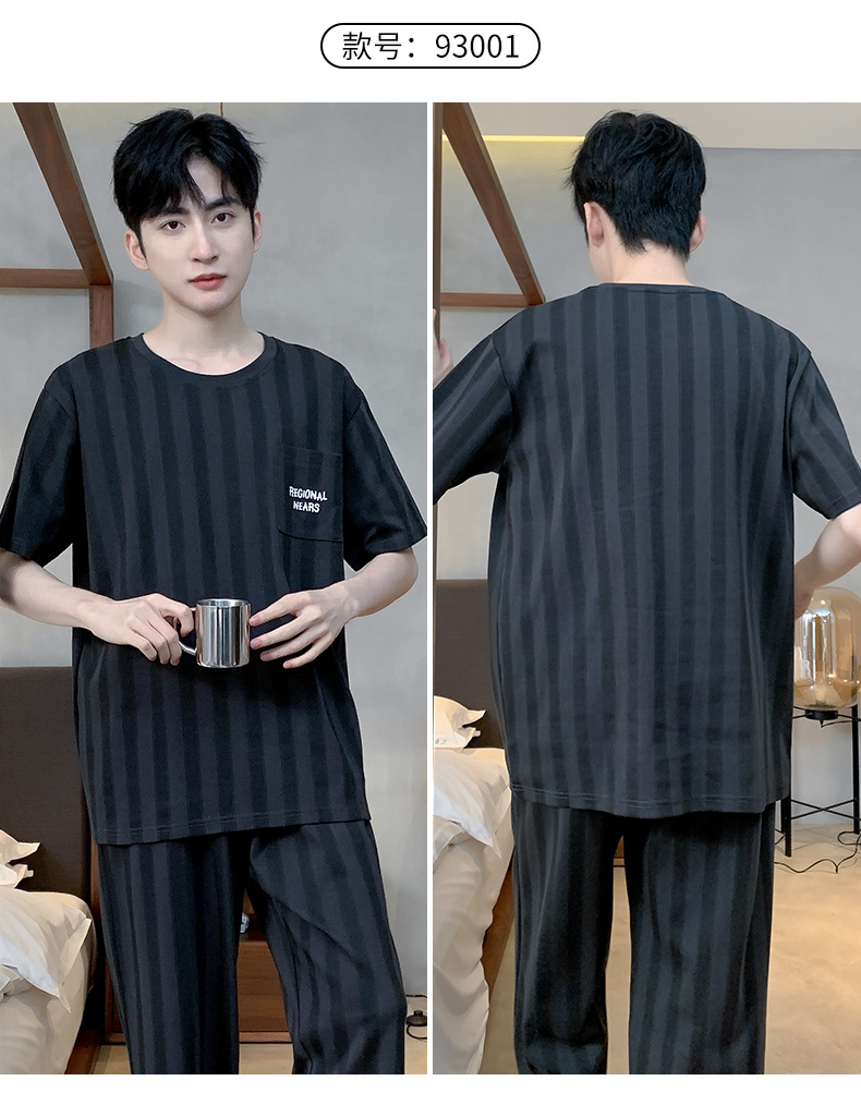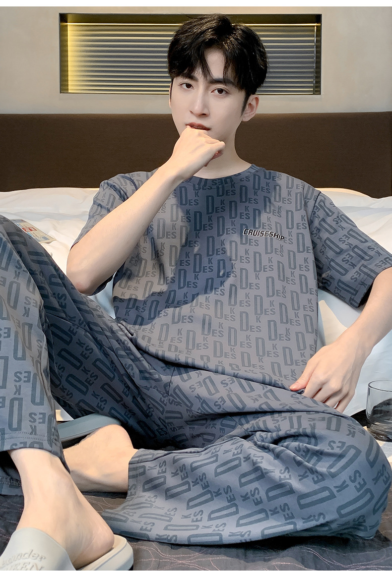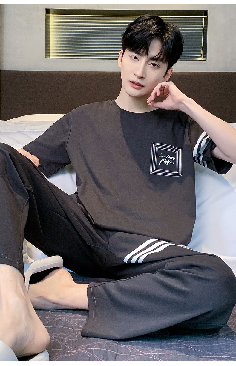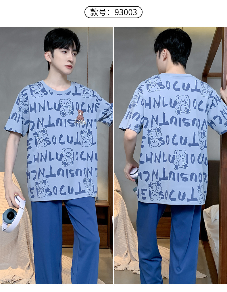 純綿男性パジャマ夏の新型丸首カジュアルサイズは綿半袖ズボンの家庭服セットを着ることができます。