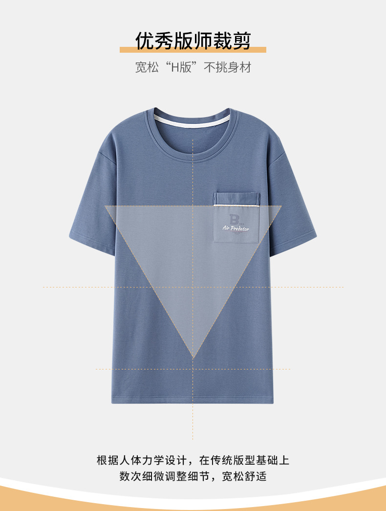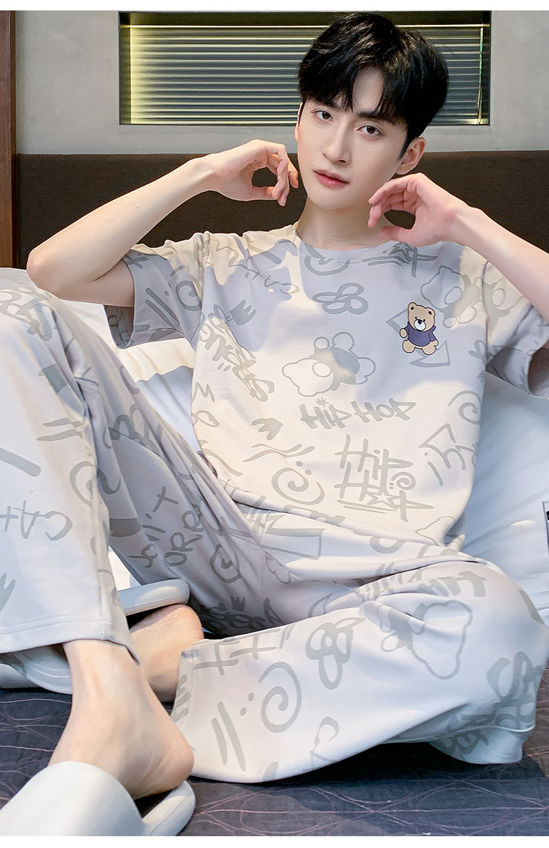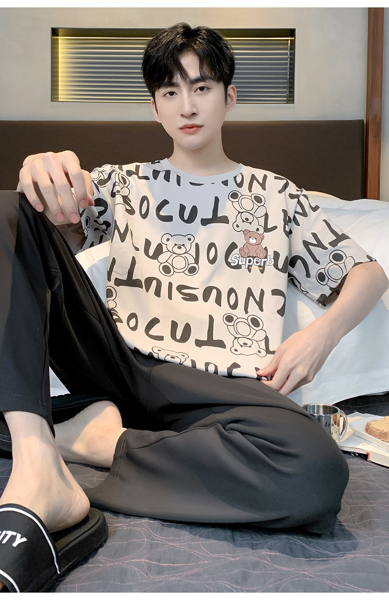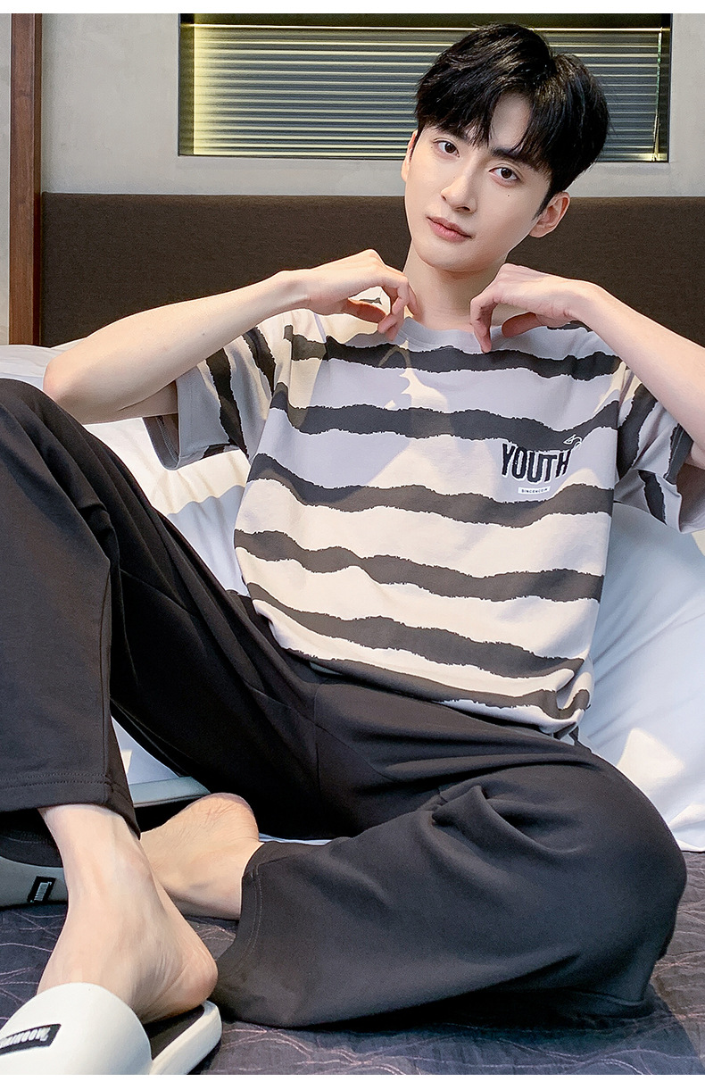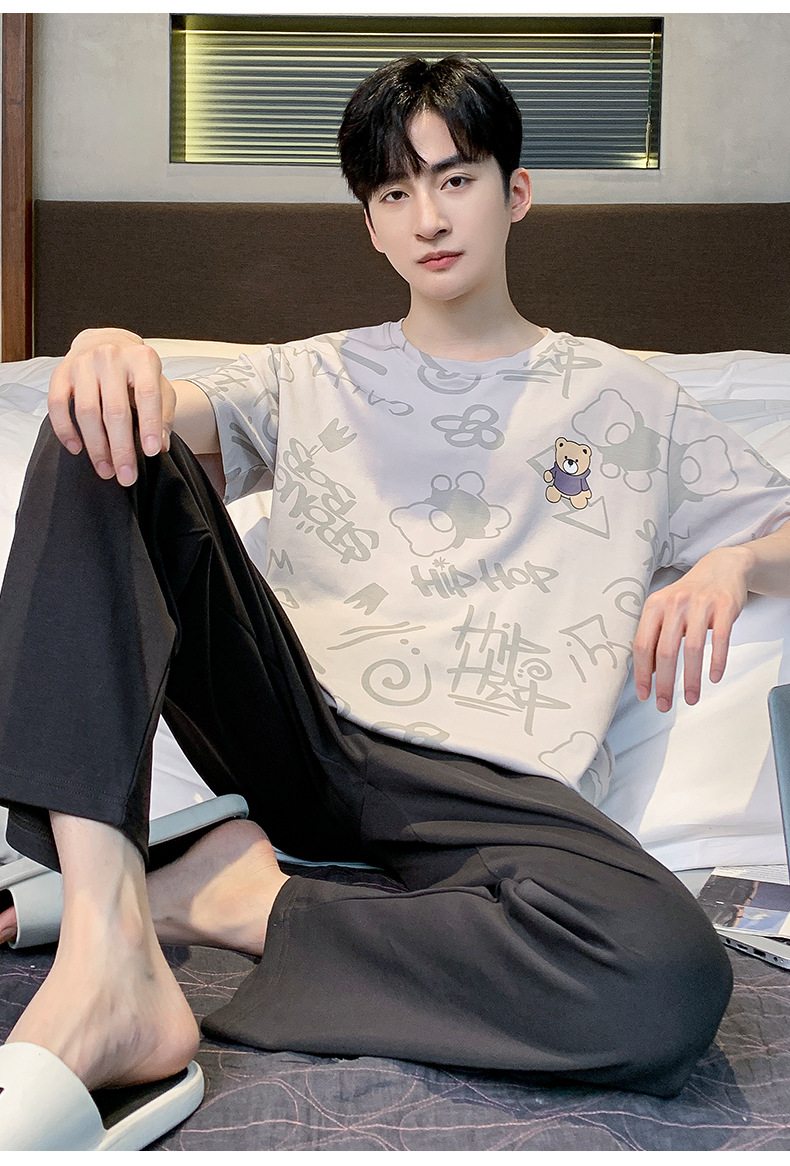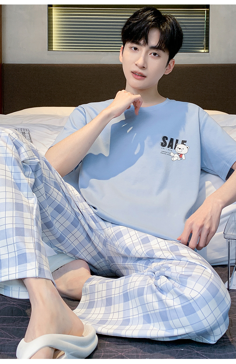 純綿男性パジャマ夏の新型丸首カジュアルサイズは綿半袖ズボンの家庭服セットを着ることができます。