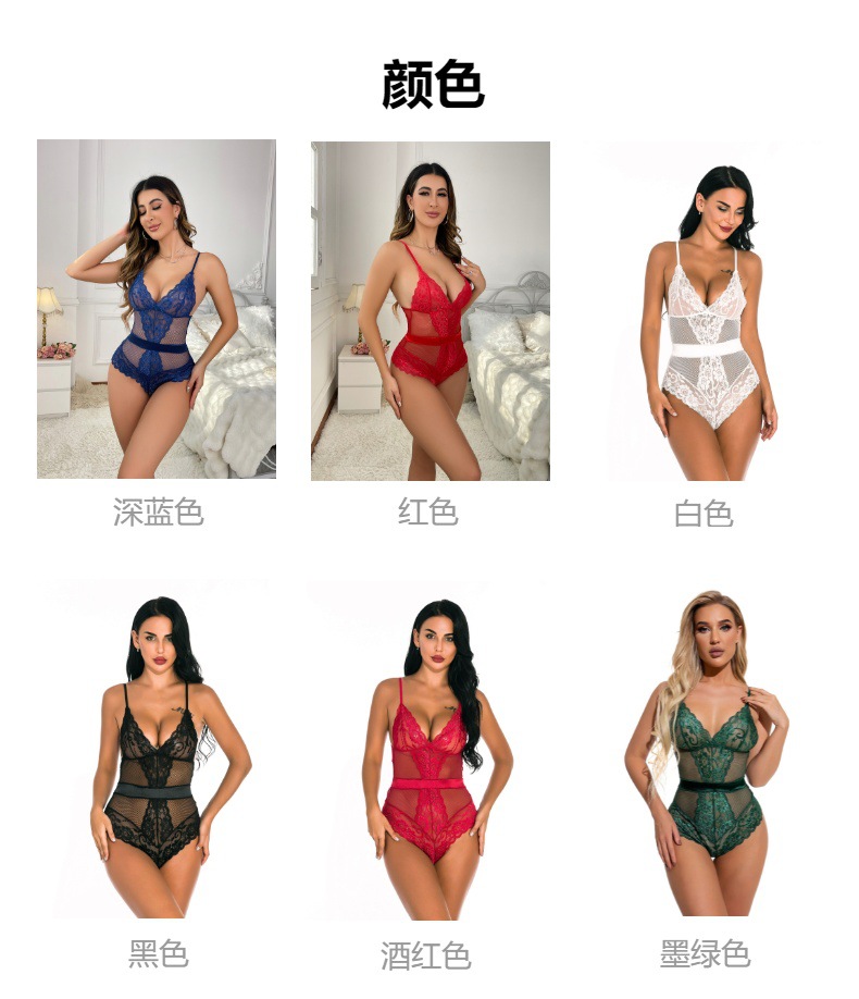 欧米の2023婦人服レースのまつげは胸の前の透かし彫りのセクシーな下着の深いvネックの後ろの帯の連体の服をつなぎます。