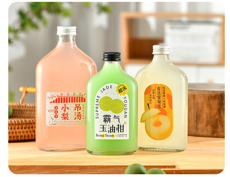斜め肩のジュースの飲み物の瓶のネットの赤い哺乳茶の瓶のコーヒーの瓶はお茶の透明なガラス瓶を浸します。