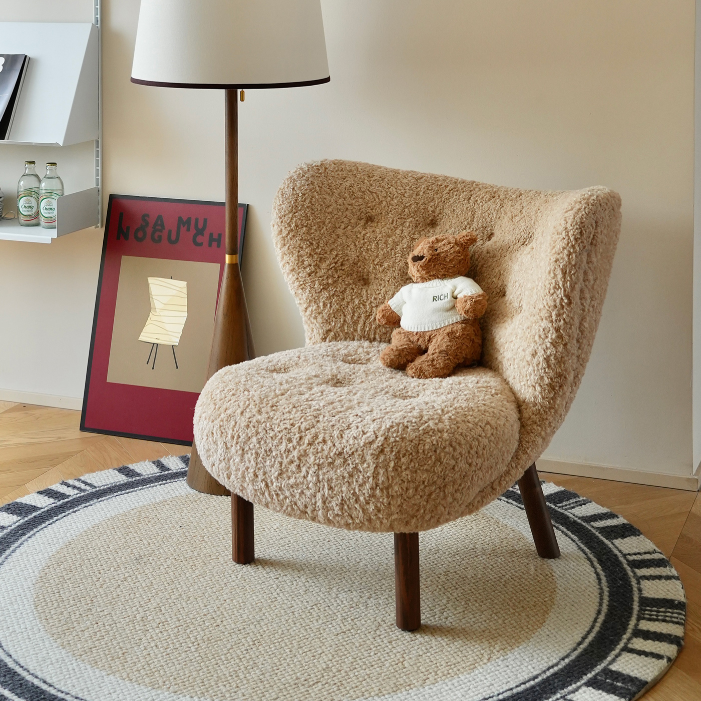 羊羔毛人沙发椅设计师侘寂风实木小佩特拉法式休闲懒人椅沙发躺椅