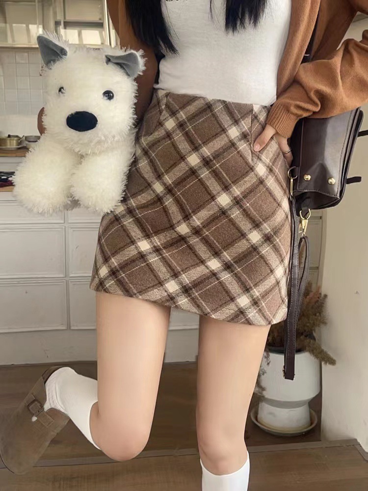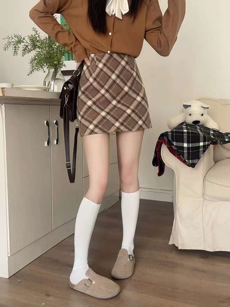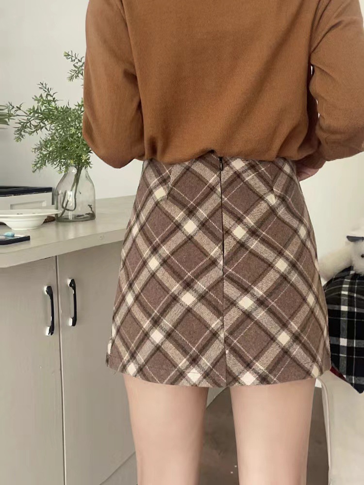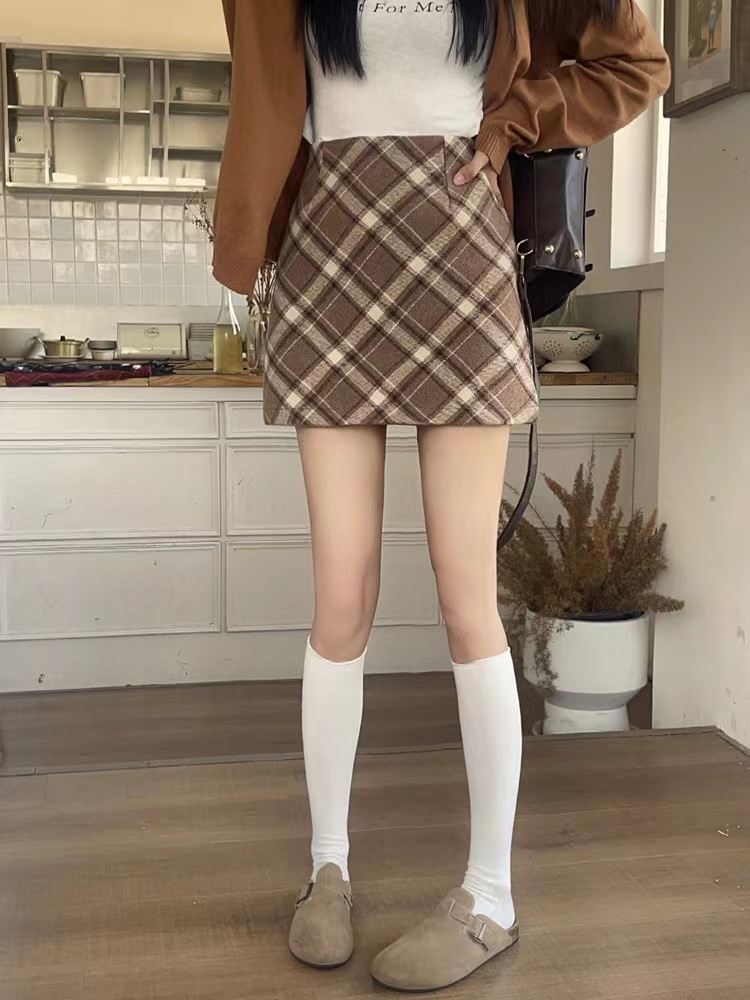 ウール素材のチェック柄スカート レディース 秋冬新作 ショートスカート ハイウエスト 着痩せ効果 Aラインスカート お尻をカバーするスカート