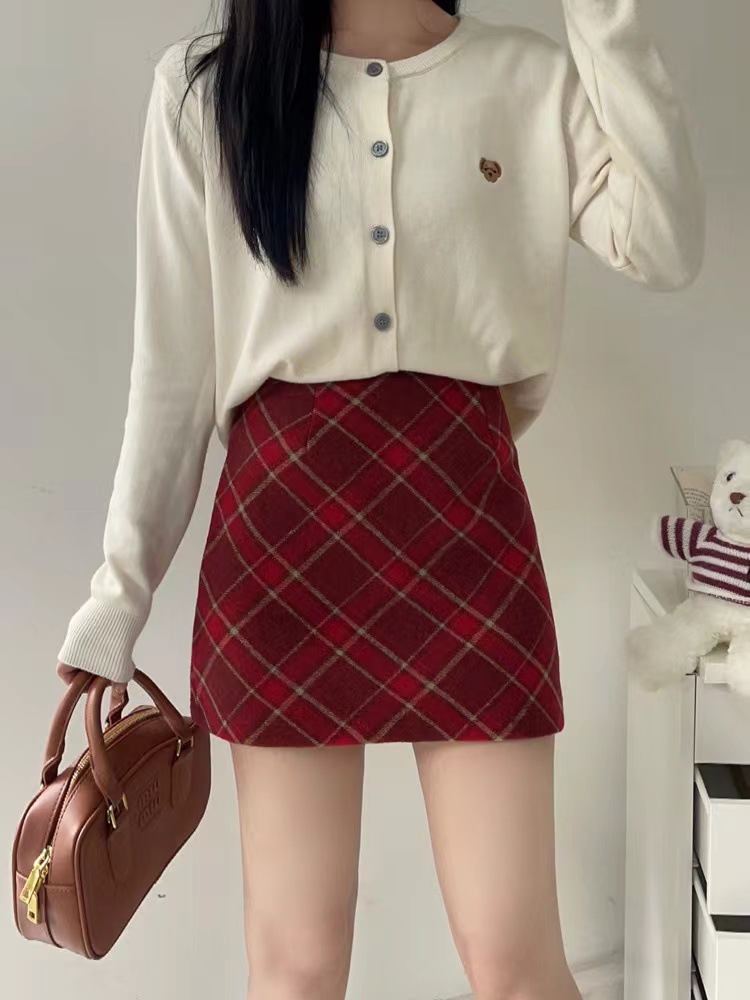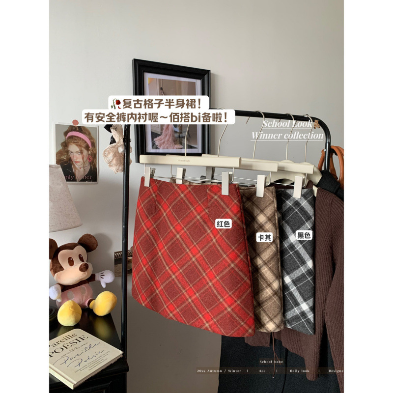 毛呢格子半身裙女秋冬厚实高腰显瘦a字包臀复古红色格纹短裙