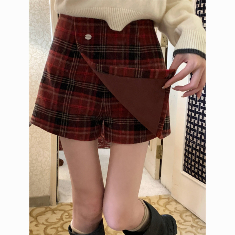 高腰不规则红色格纹裙半身裙女秋冬美式复古A字短裙子毛呢裙裤