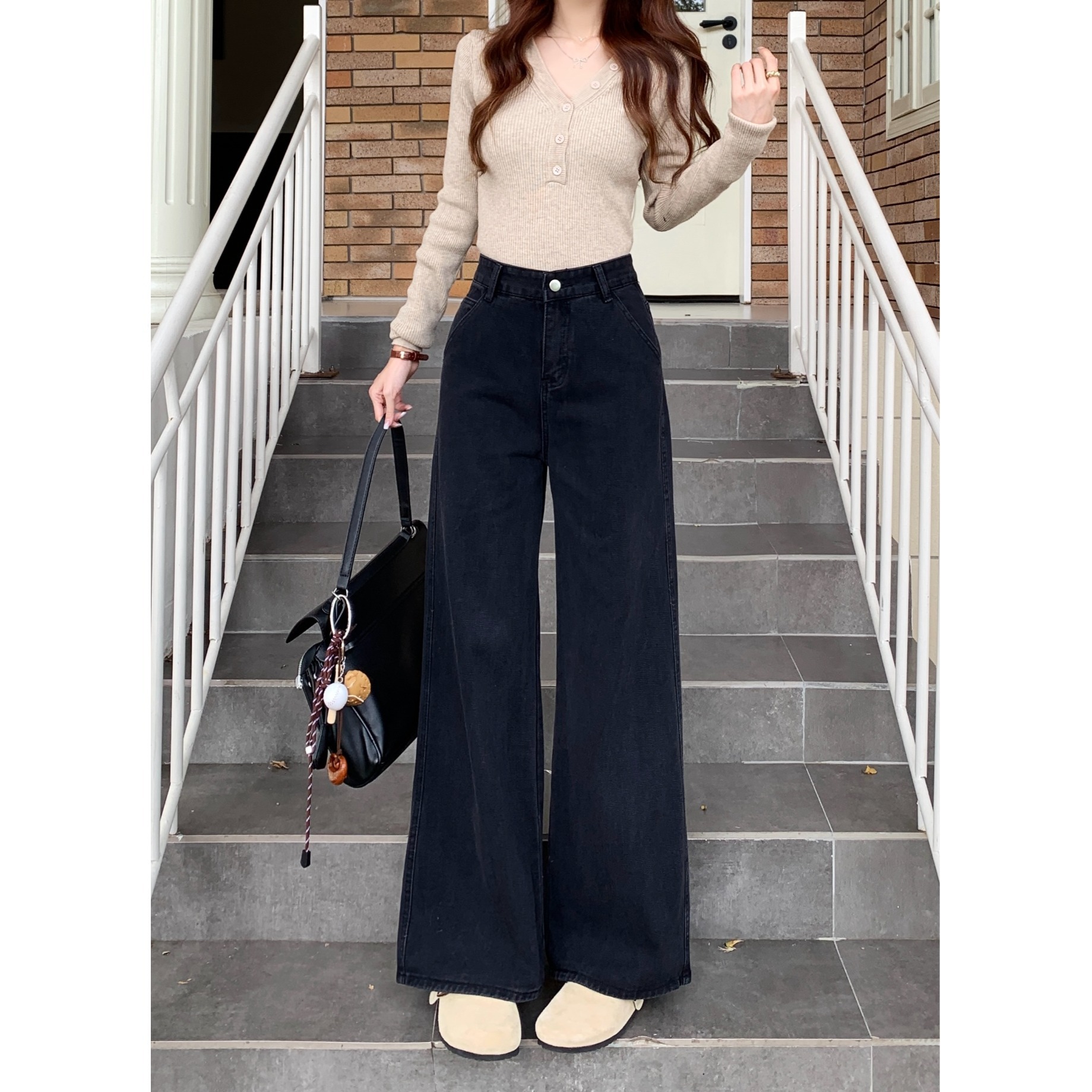 ストレートにベルベットをつけてジーンズを厚くした女性は冬に2024の新しい高腰ゆるい学生の広脚ズボンを着て保温する