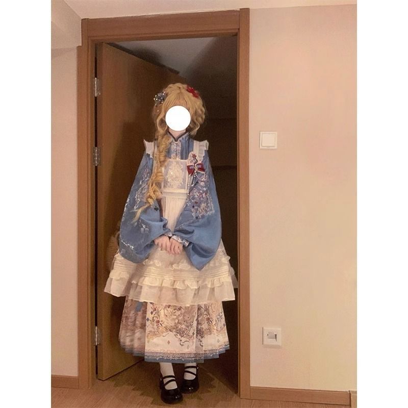 漢洋折衷明朝漢服織金模造花ブルースタンドカラーピパスリーブカーディガンオーバースカート馬面スカートロリータ
