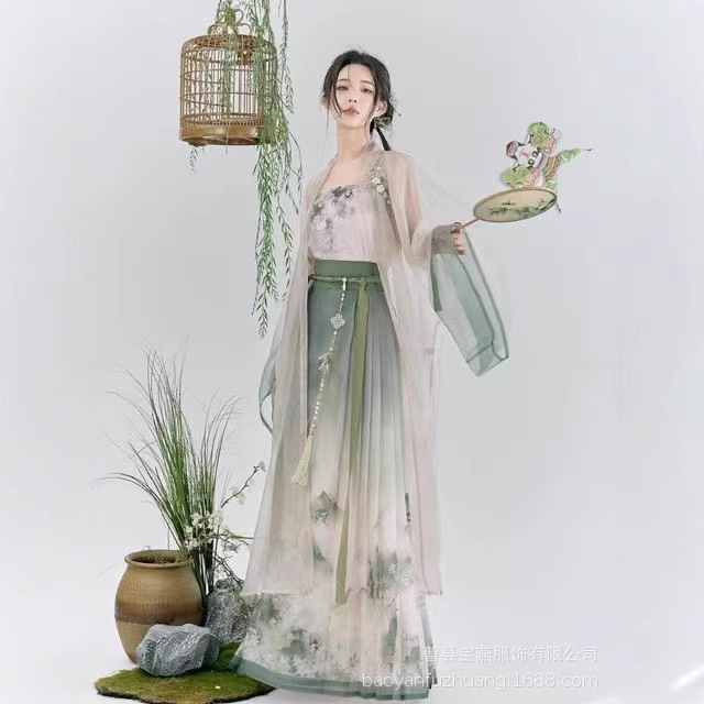 明製の漢服の半高襟のシャツの上着は化粧の花の馬のスカートのスーツの羽の服の墨の緑の青羽の馬のスカートをまねます。