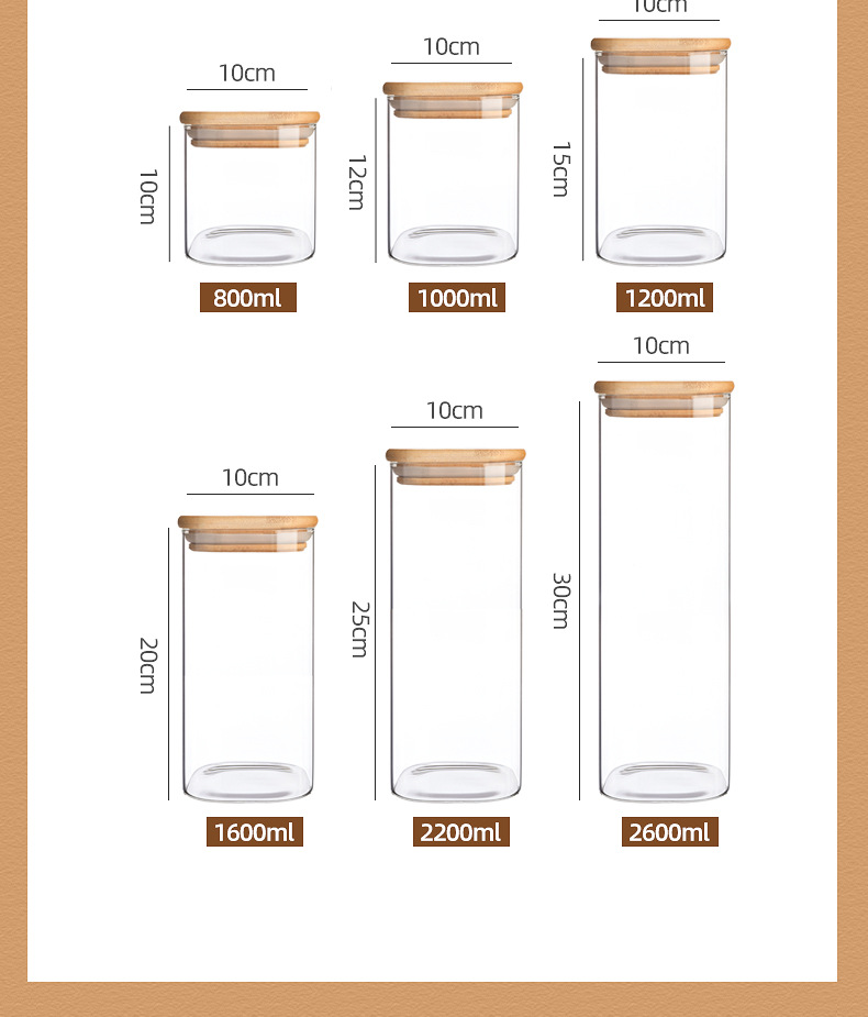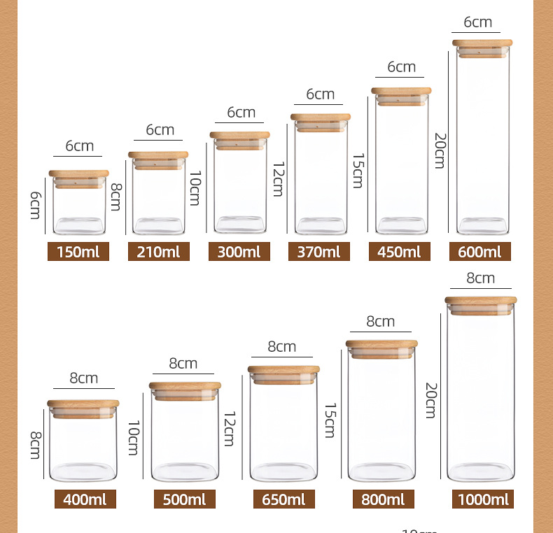 6cm*6cm+竹蓋 150ml&1(200本/箱),6cm*8cm+竹蓋210ml (200本/箱),6cm*10cm+竹蓋 300ml (160本/箱),6cm*12cm+竹蓋370ml(茶箱140個/カートン、エッググリッド160個/カートン),6cm*15cm+竹蓋 450ml (120本/箱),6cm*20cm+竹蓋600ml(80本/箱),8cm*8cm+竹蓋 400ml (120個/箱),8cm*10cm+竹蓋500ml(120個/箱),8cm*12cm+竹蓋 650ml (120本/箱),8cm*15cm+竹蓋800ml (90個/箱),8cm*20cm+竹蓋1000ml(60本/箱),10cm*10cm+竹蓋800ml (100個/箱),10cm*12cm+竹蓋1000ml (100個/箱),10cm*15cm+竹蓋 1200ml (75本/箱),10cm*20cm+竹蓋1600ml(50本/箱),10cm*25cm+竹蓋2200ml(50本/箱),10cm*30cm+竹蓋2600ml (40本/箱),ストライプ 高さ10cm 容量750ml (100本/箱),ストライプ 高さ10cm 容量12cm 800ml (100本/箱),ストライプ 高さ10cm 容量15cm 1100ml (75本/箱),ストライプ 高さ10cm 容量20cm 1500ml (50本/箱),ストライプ 高さ10cm 25cm 容量1850m (50本/箱) l,ストライプ 高さ10cm 容量30cm 2300ml (40本/箱),パールコットン5点セット,スプーン付きスクエア保存瓶 パールコットンセット