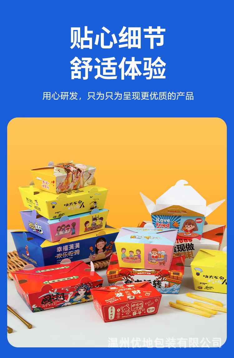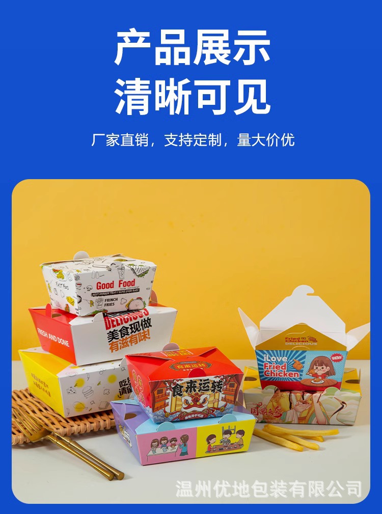 フライドチキンのテイクアウトボックスは無料です。韓国風フライドチキンの包装箱は鶏肉とフライドポテトの商用防油包装箱シリーズです。