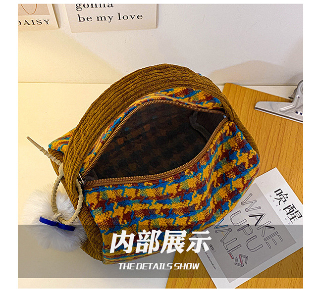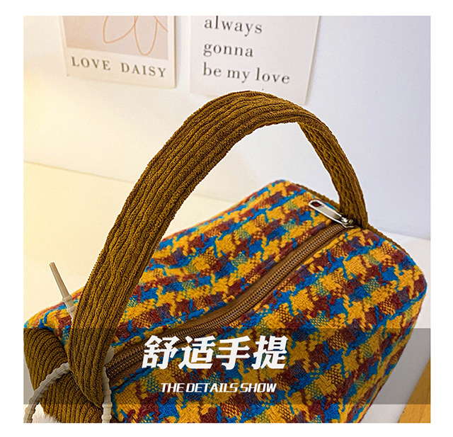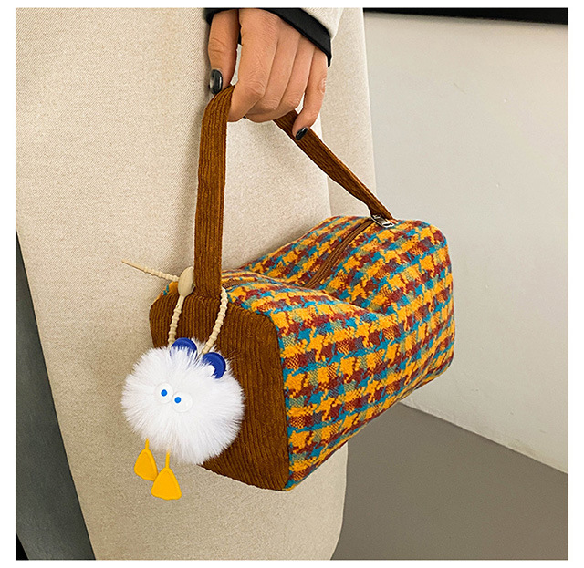 バッグの女性が出勤しているバッグはかわいい毛のふわふわしたフグが千鳥の格子のハンドバッグを持って外出化粧バッグを持っている