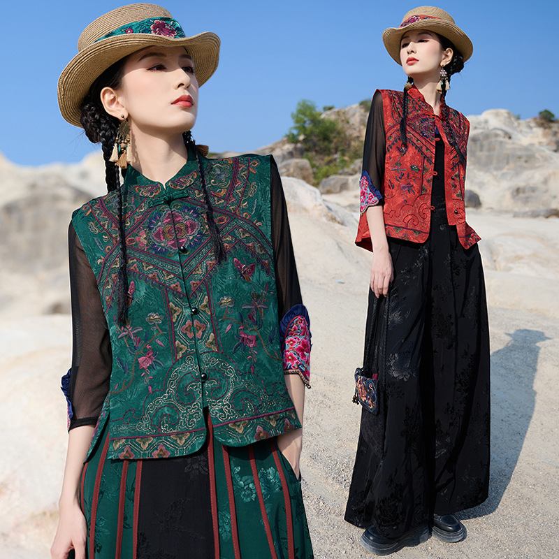 新しい女性のエスニックスタイル刺繍スタンドカラージャカードサテンブロードウェーブエッジ裾ルーズファッションチョッキ