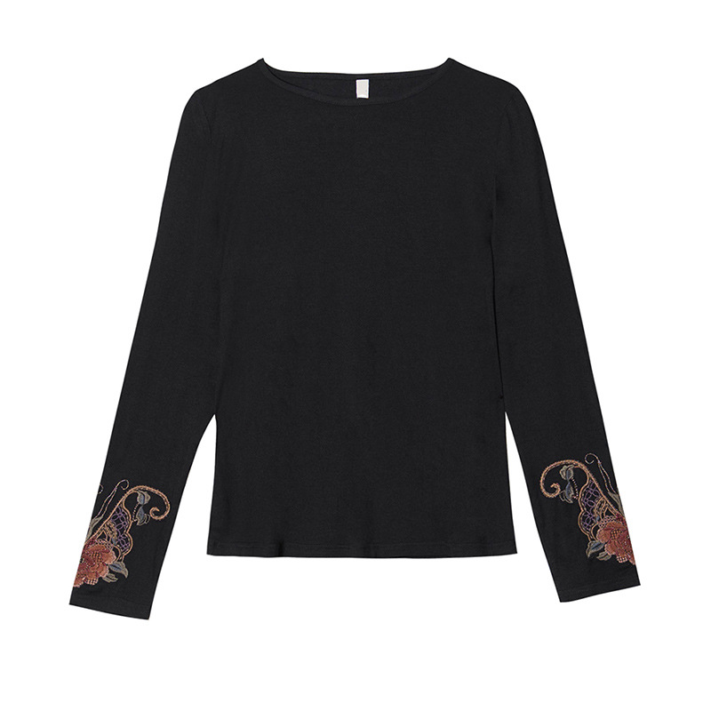 四季モデルのやせ気質モデルvネック再加工刺繍ネット糸底シャツ黒百合長袖tシャツ上着