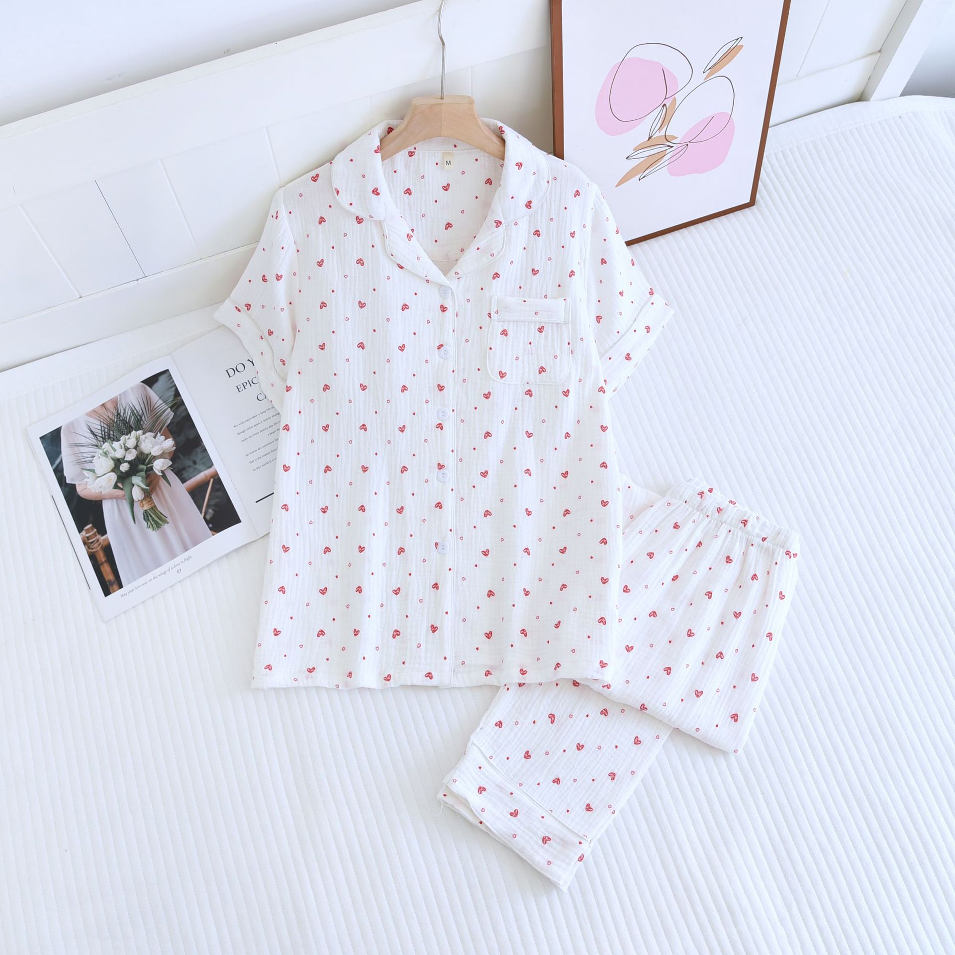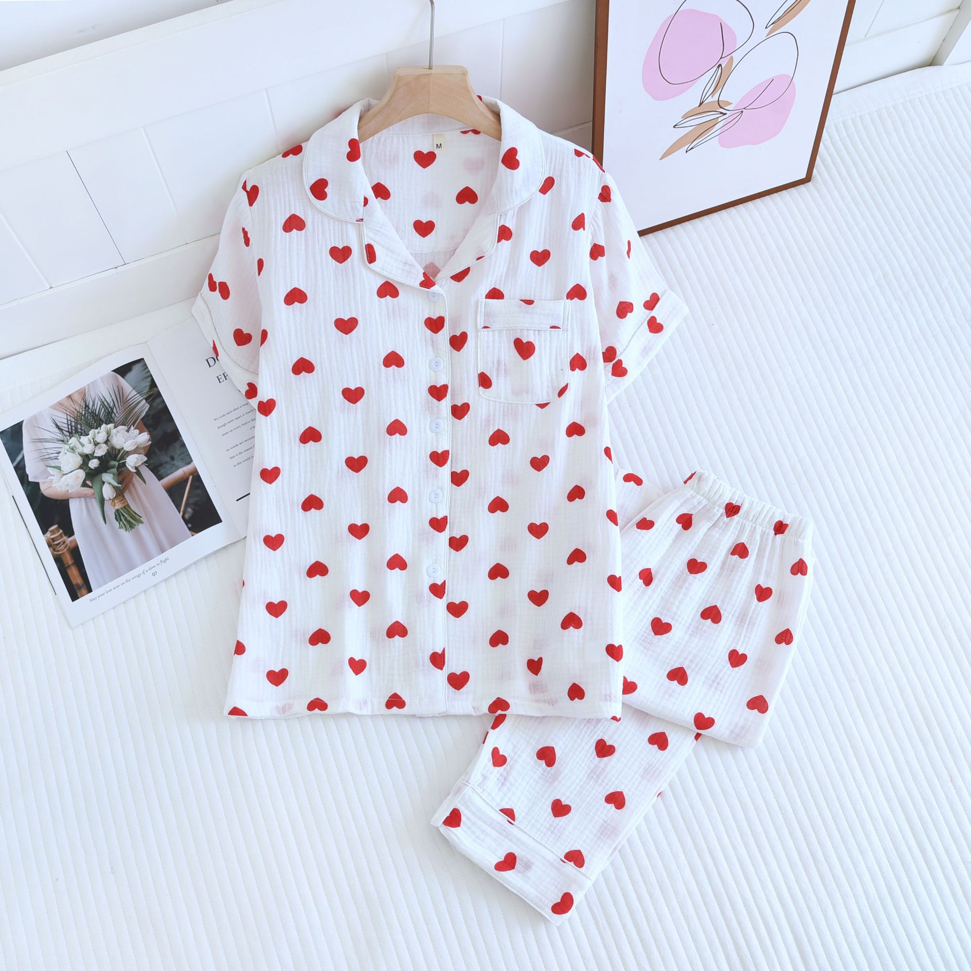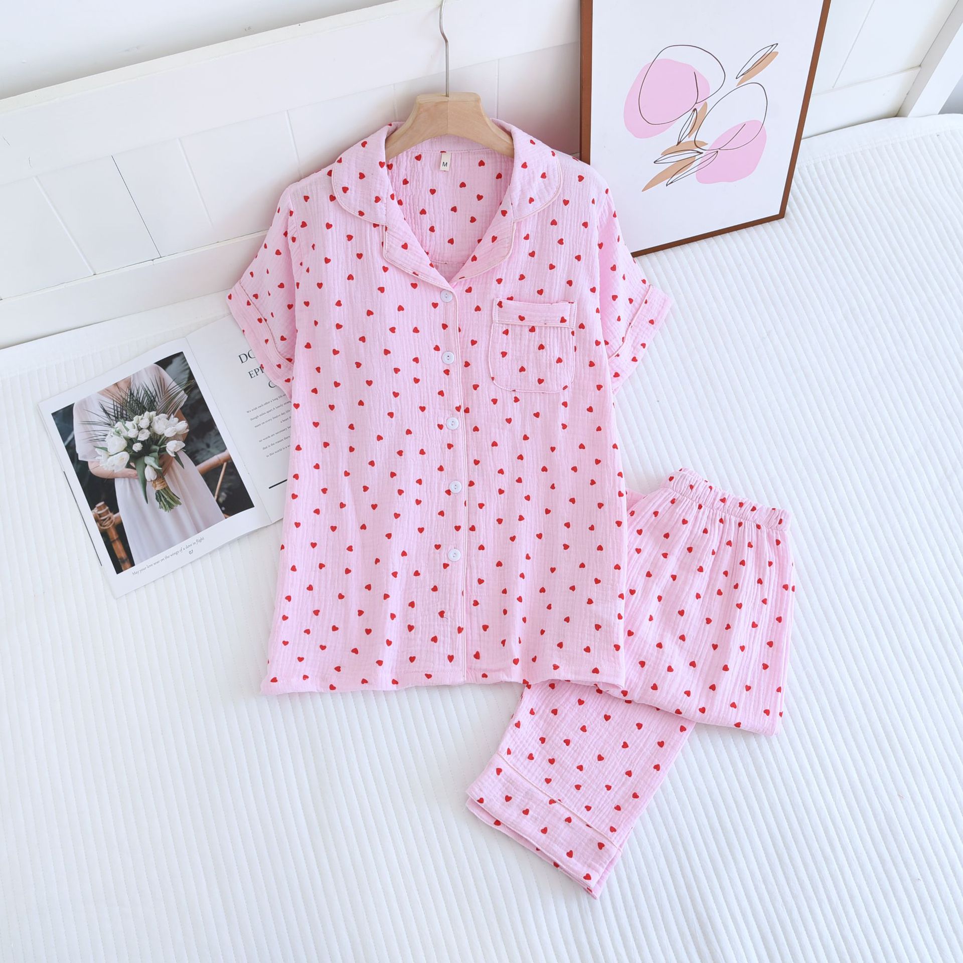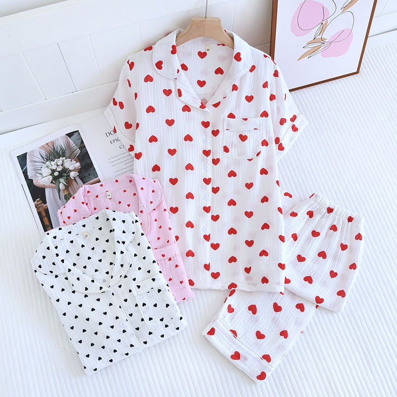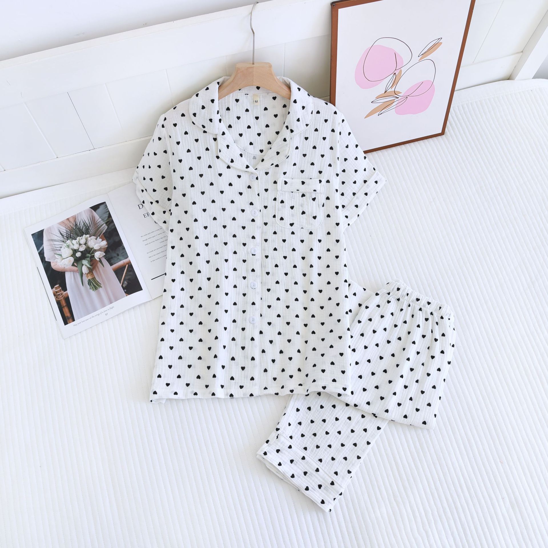 4サイズの先染めジャカードラペル半袖ズボンパジャマセット女性用春、夏、秋の薄い綿二層糸ホーム服