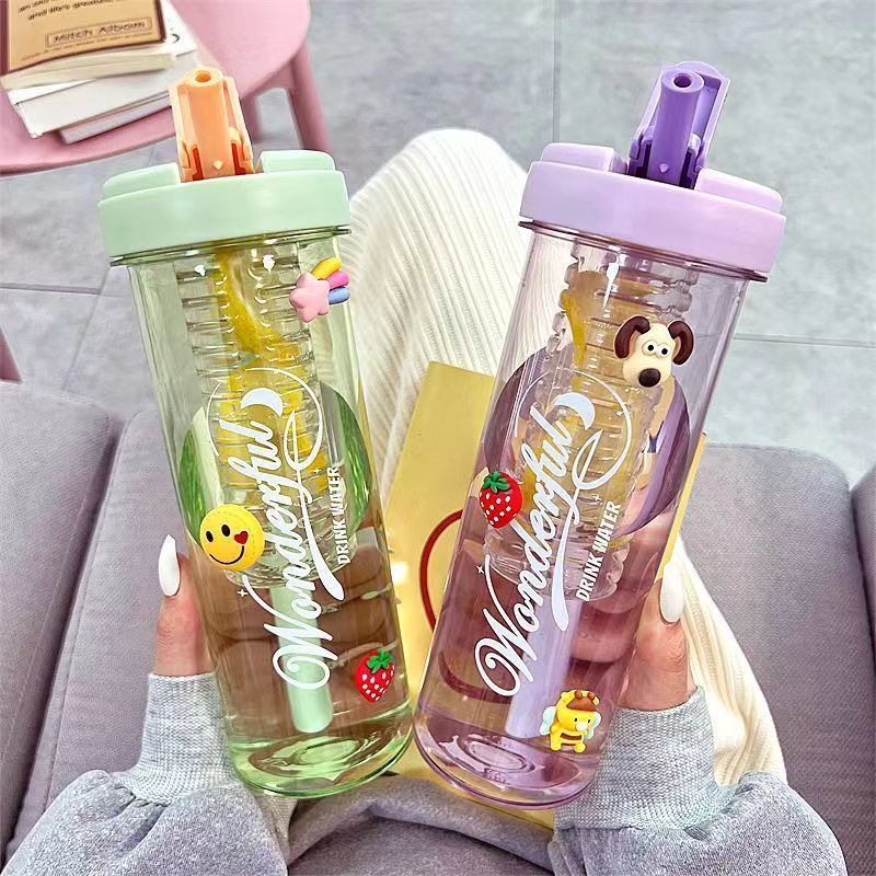 二重蓋のかわいい二重飲み口プラスチックカップ、学生向け高見えストロー付き水筒、漫画風携帯カップ、夏のギフト水筒