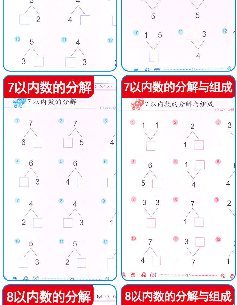(2冊160ページ) 10+20の分解で構成,(2冊160ページ) 10+20以内口頭算数カード,(2冊160ページ) 10以内の分解+口頭算数カード,(2冊160ページ) 20以内の分解+口頭算数カード,(1冊あたり80ページ) 10以内で構成,(1冊あたり80ページ) 10枚以内の口頭算数カード,(1冊あたり80ページ) 20ページ以内で構成,(1冊あたり80ページ) 口頭算数カード20枚以内,(全4冊) 10+20 分解+口頭算数カード
