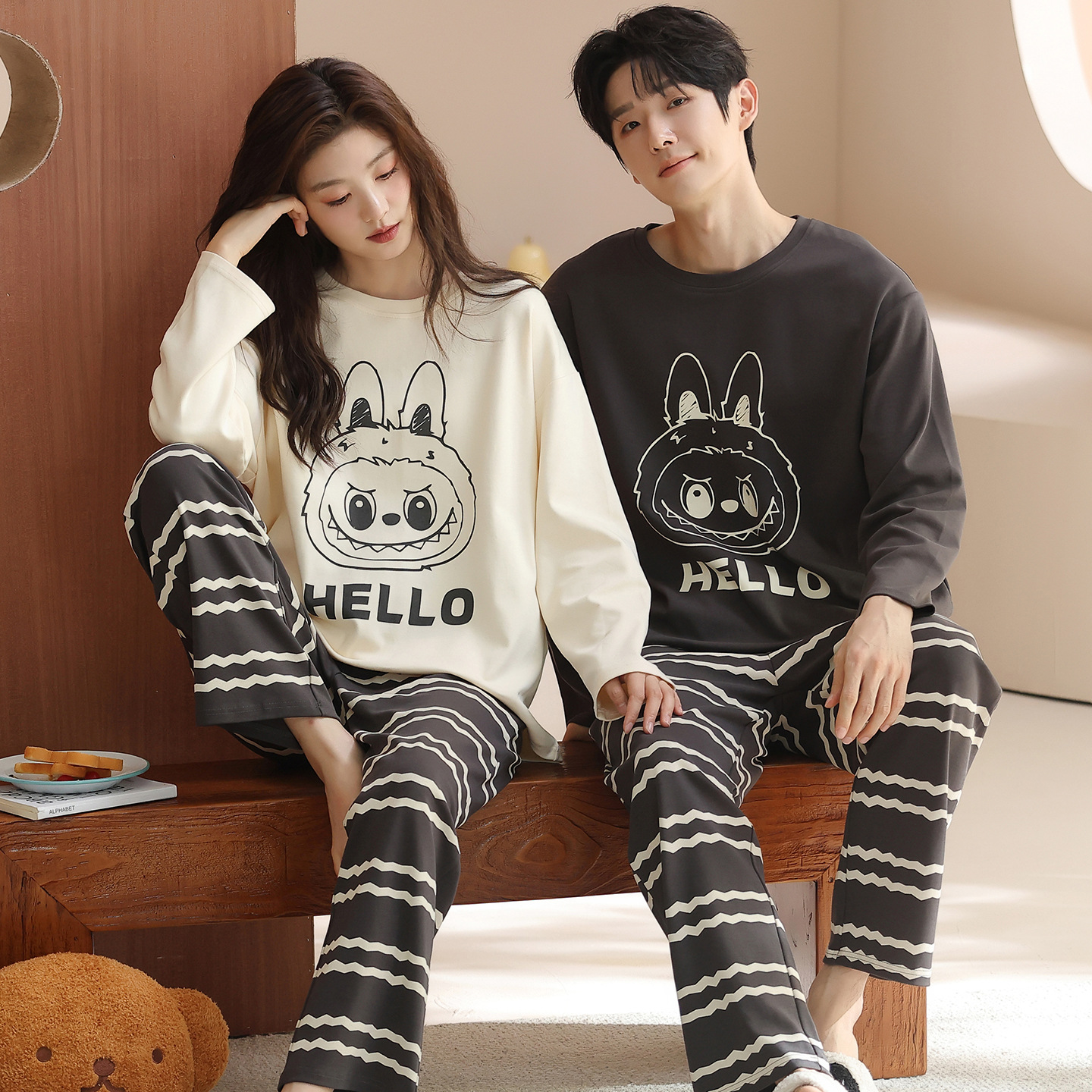【100% 純綿】カップルパジャマ女性春と秋の綿100% 長袖セット男性ホームウェア可愛いアニメ