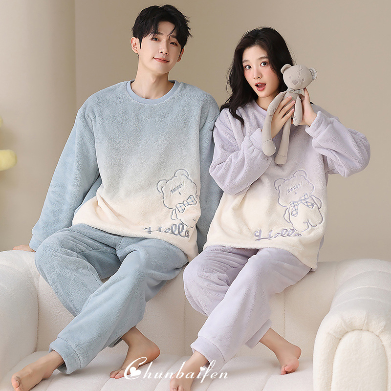 情侣睡衣秋冬季2025年新款法兰绒卡通可爱加绒加厚圆领家居服套装