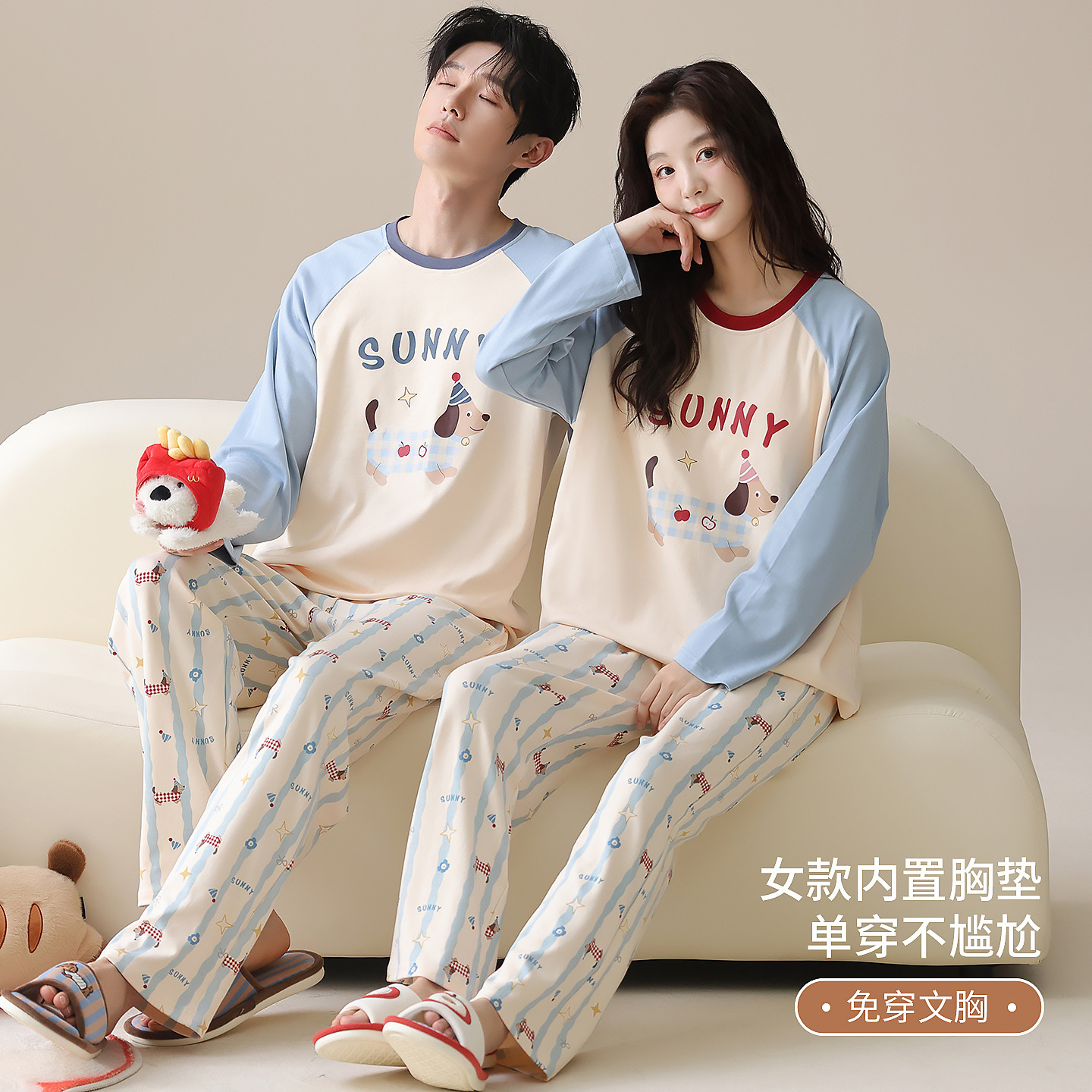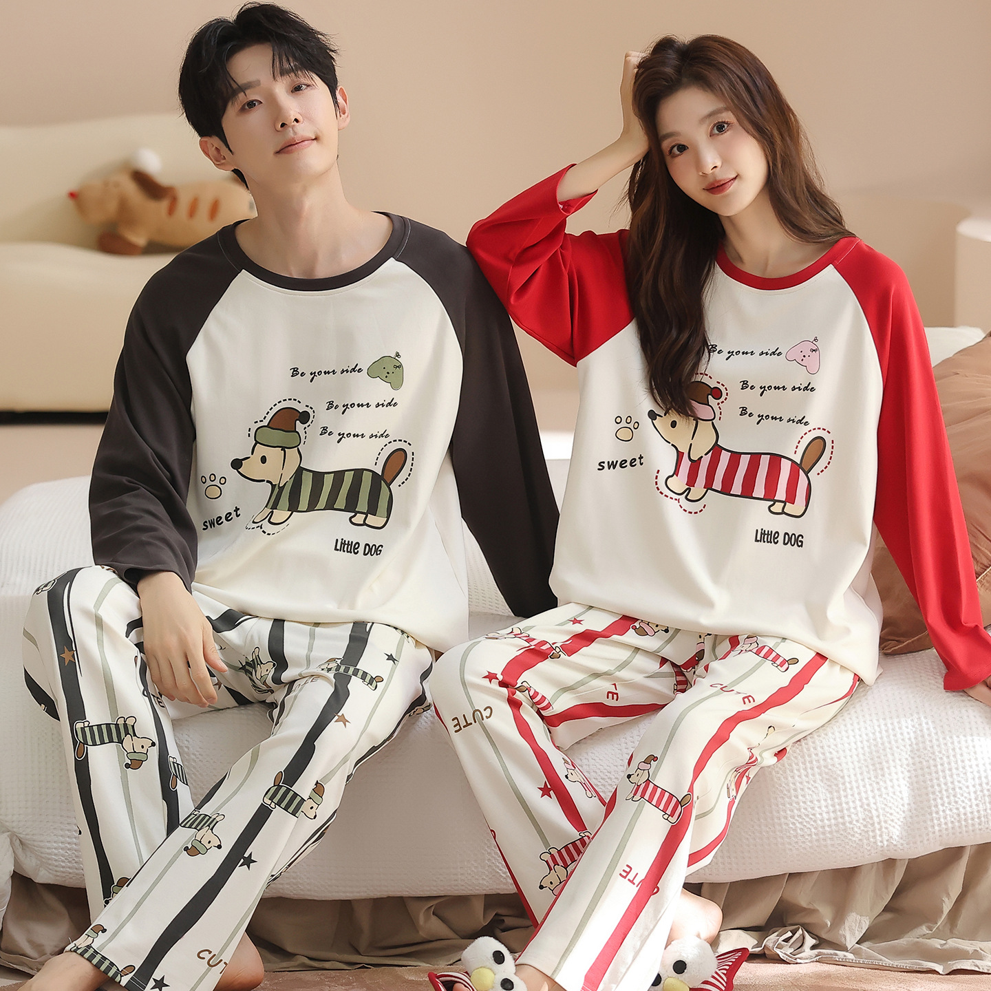 纯棉情侣睡衣女款秋新款长袖家居服可爱卡通小狗可外穿男士套装