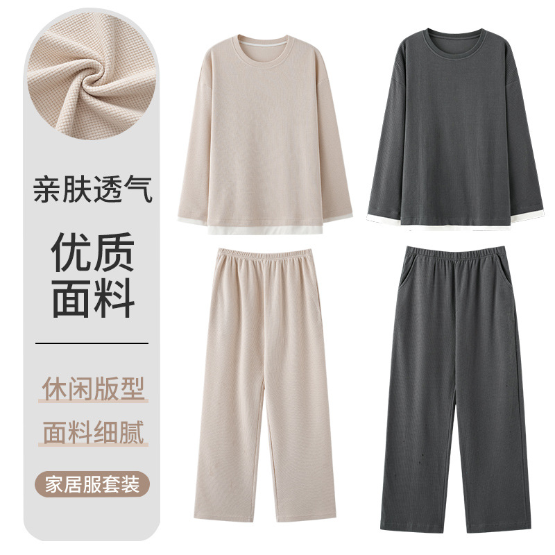 【100% 純綿】カップルパジャマ女性春と秋のワッフル長袖長ズボンセットシンプルな男性ルームウェア
