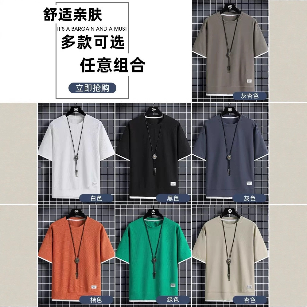 华夫格短袖T恤男拼接圆领假两件夏季简约宽松套头薄款五分袖