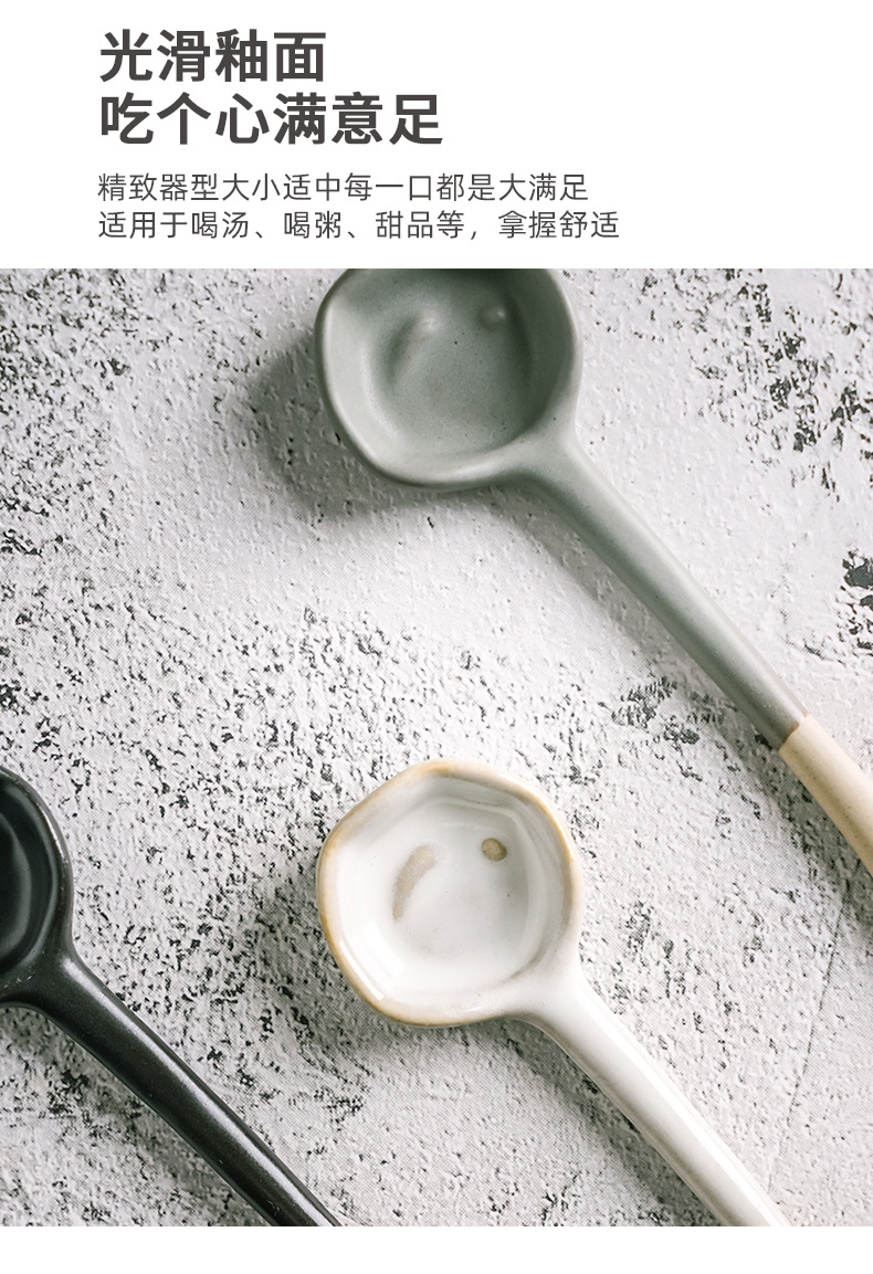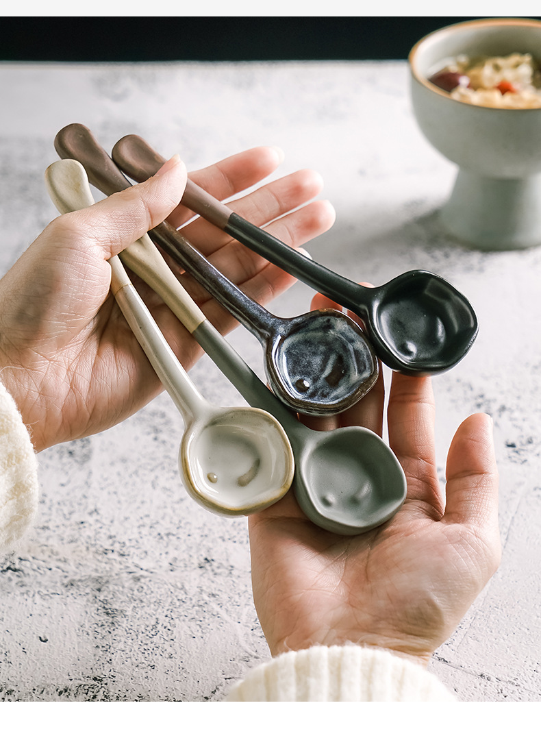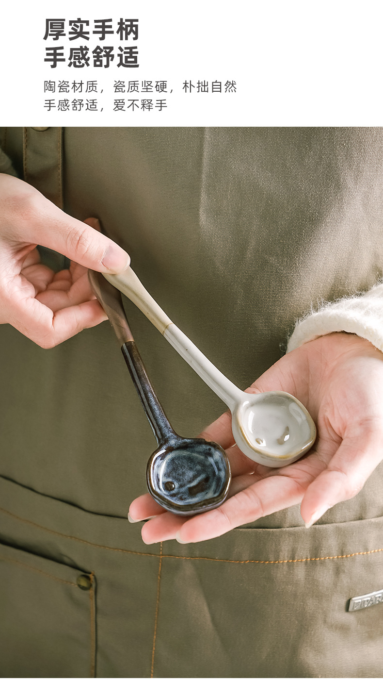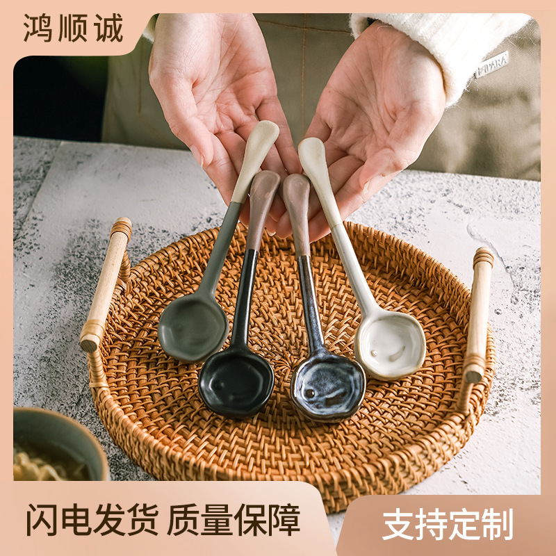 レトロな日本式家庭用キッチンスープ手作り陶磁器スプーントランペット高颜値スープスプーン粗陶スプーン