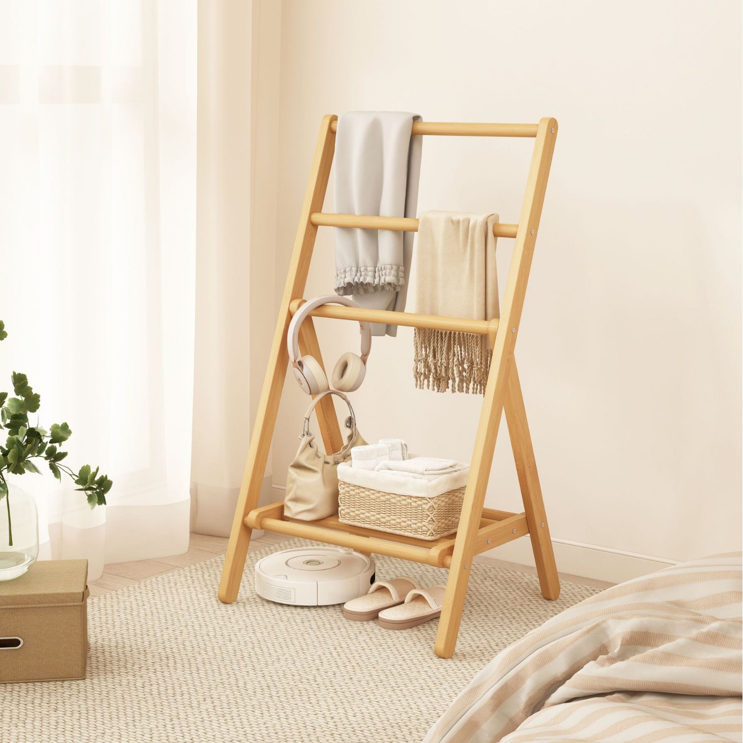 折りたたみコートラック、寝室の床置き洋服ラック、ベッドサイド洋服ラック、経済的な竹製収納ラック