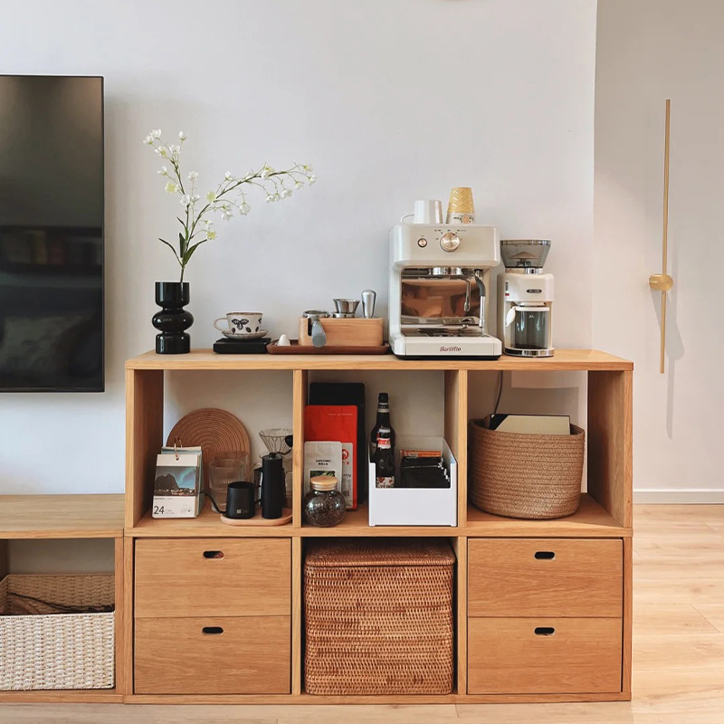 実木色の本棚が床に落ちたリビングルームの収納棚家庭用原木風物置棚テレビ収納棚の低い本棚