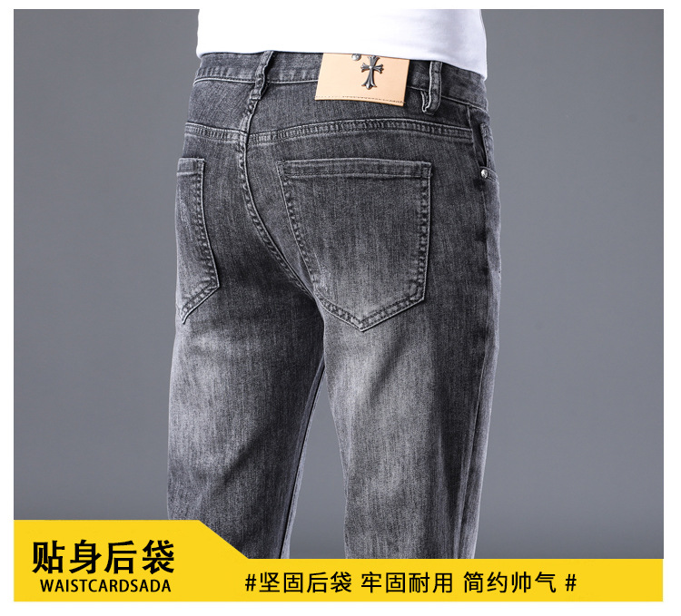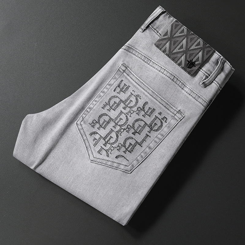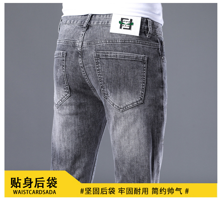 夏季薄款灰色高端烫钻牛仔裤男弹力修身休闲百搭轻奢时尚男装长裤