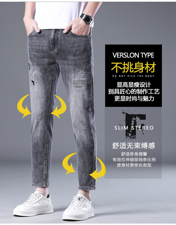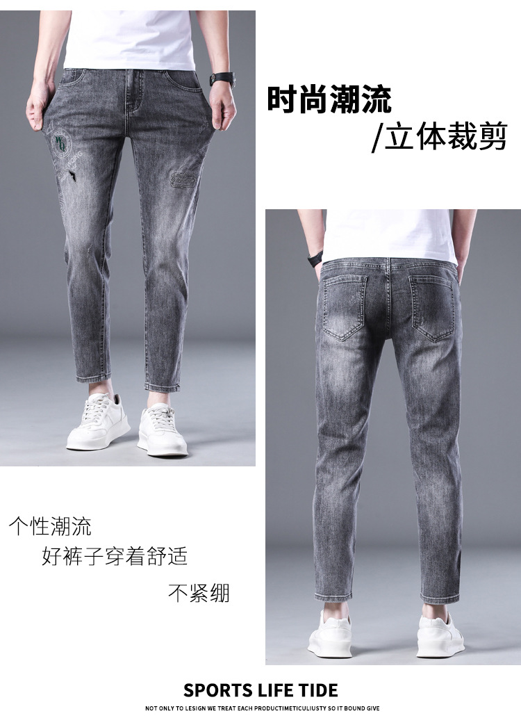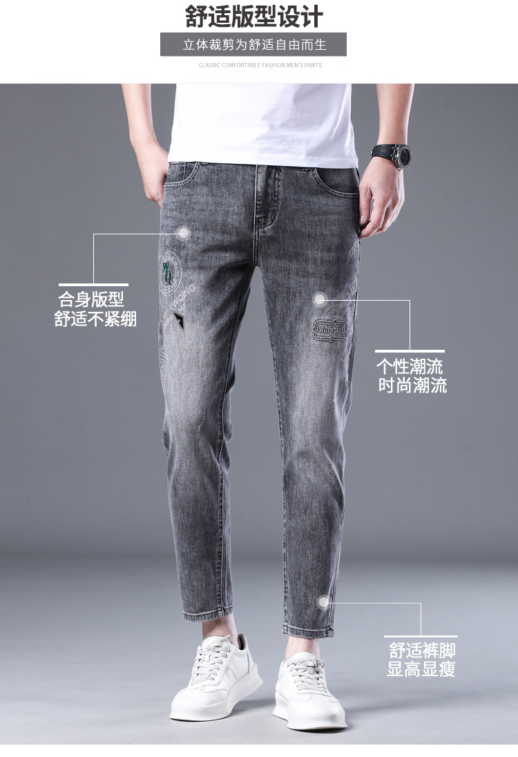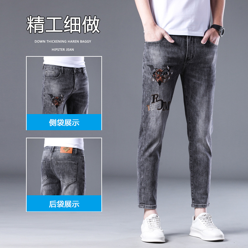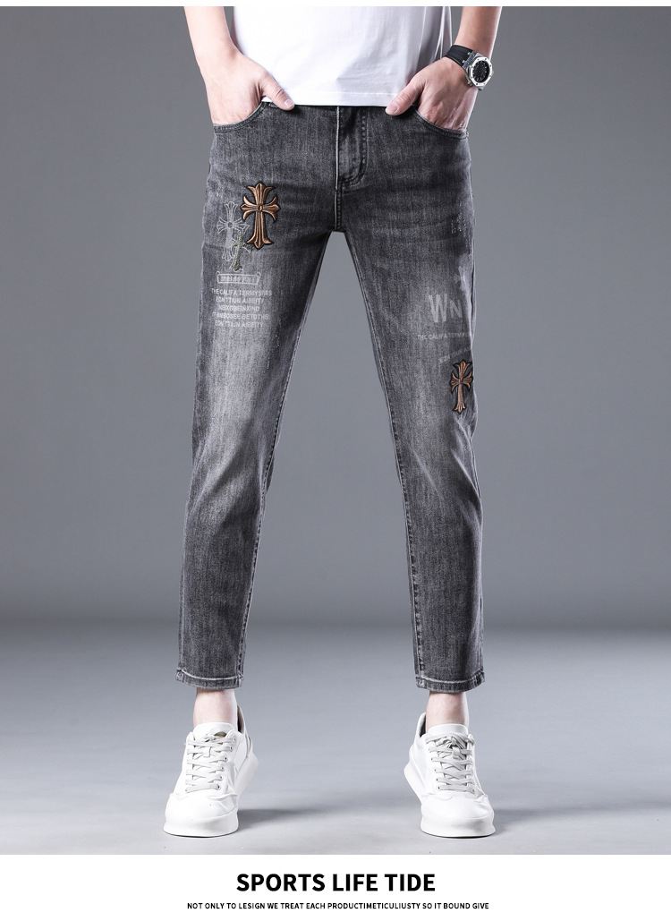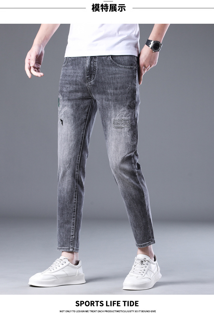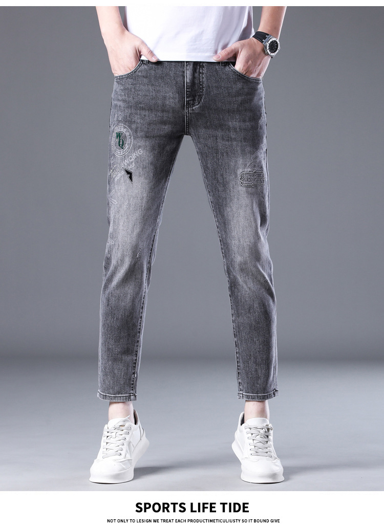 欧州風グレーのトレンドブランド刺繍入り9分丈ジーンズ、男性向け、ファッショナブルで個性的なトレンド、スリムフィット、細身のパンツ、ストレートタイプ