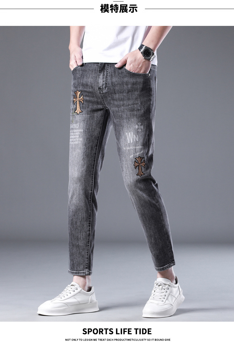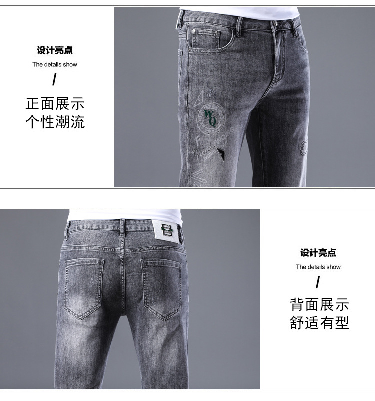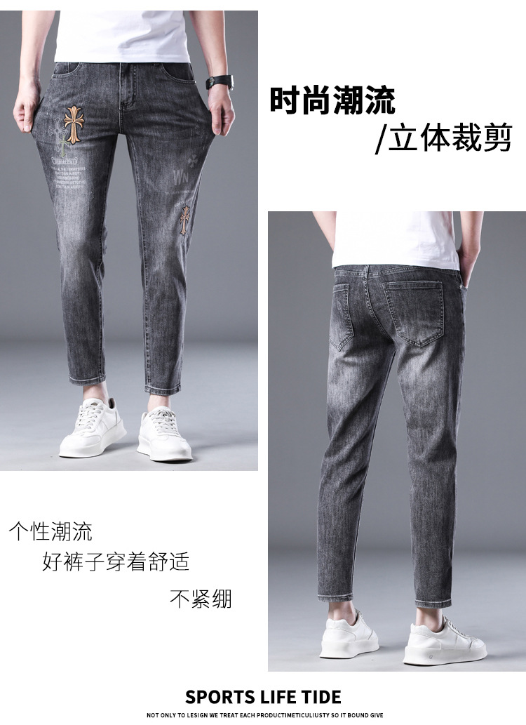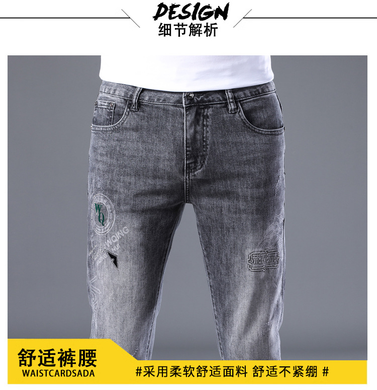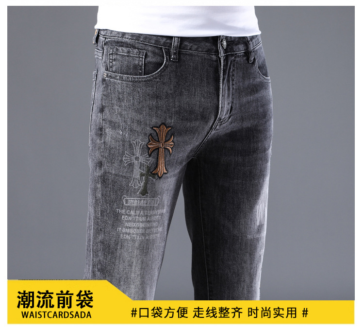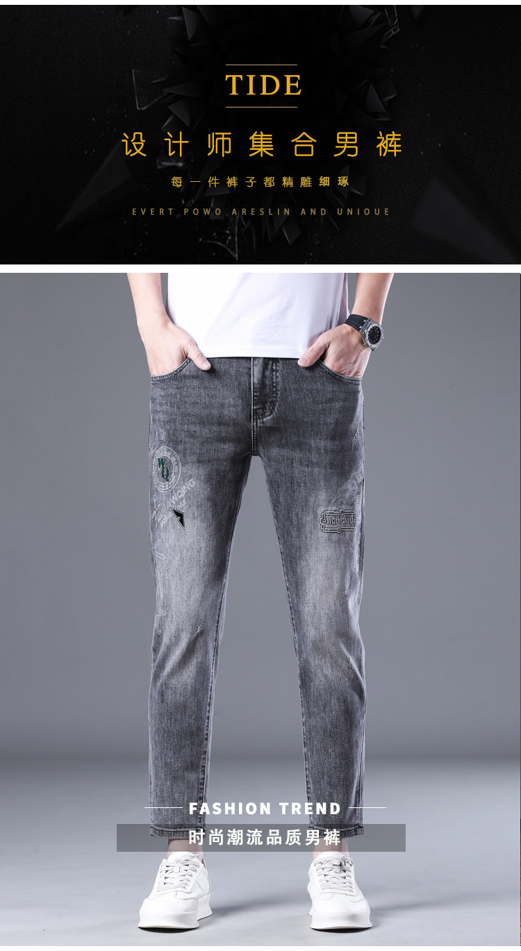 欧州風グレーのトレンドブランド刺繍入り9分丈ジーンズ、男性向け、ファッショナブルで個性的なトレンド、スリムフィット、細身のパンツ、ストレートタイプ