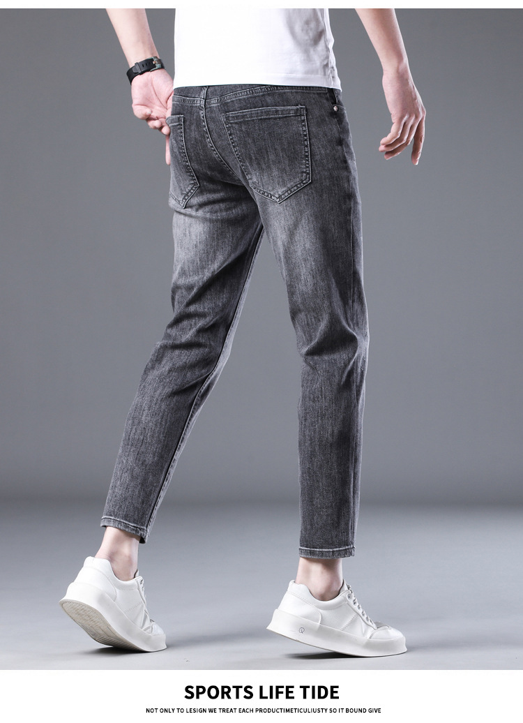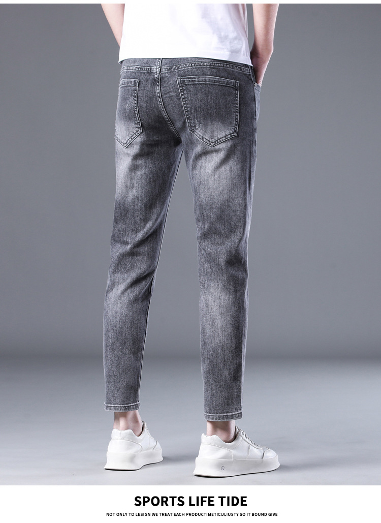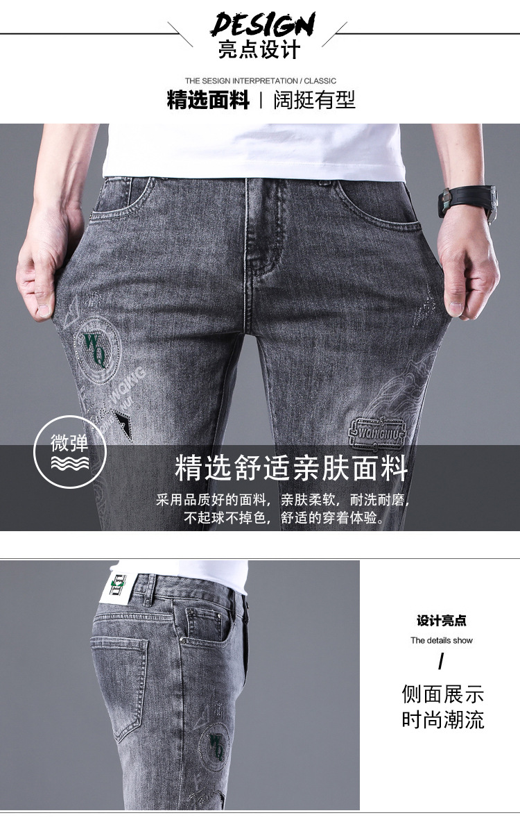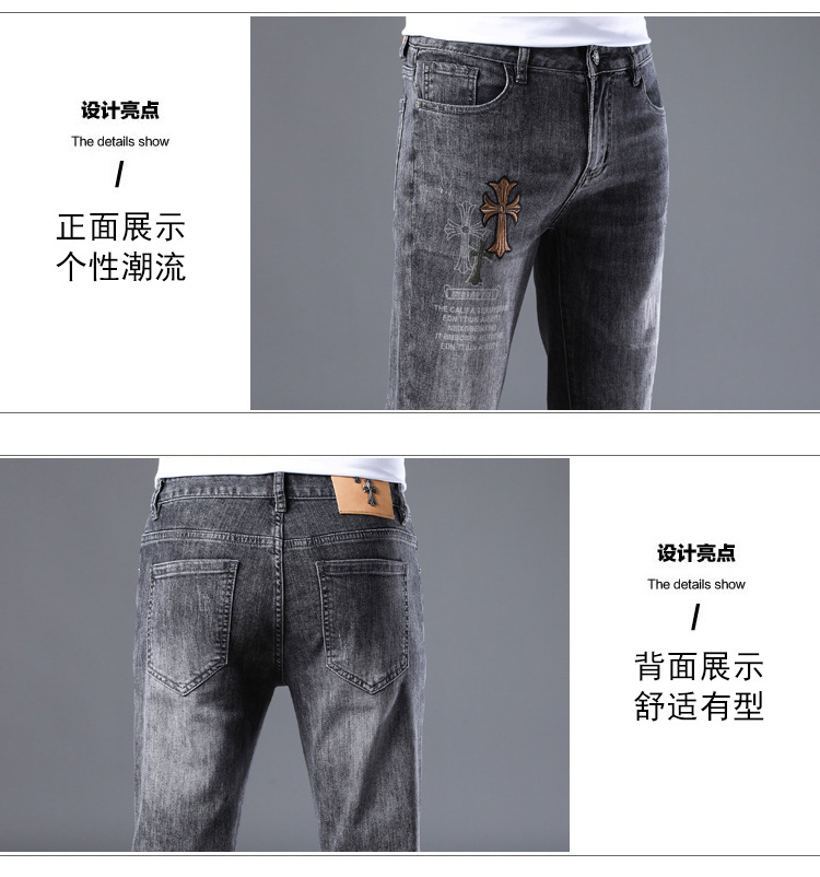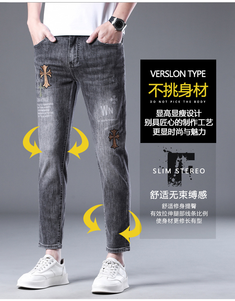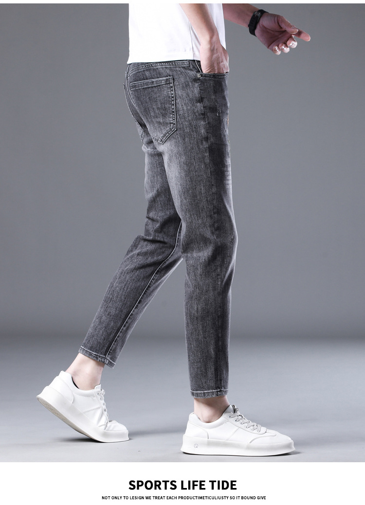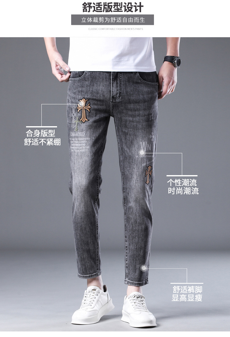欧州風グレーのトレンドブランド刺繍入り9分丈ジーンズ、男性向け、ファッショナブルで個性的なトレンド、スリムフィット、細身のパンツ、ストレートタイプ