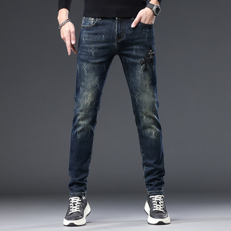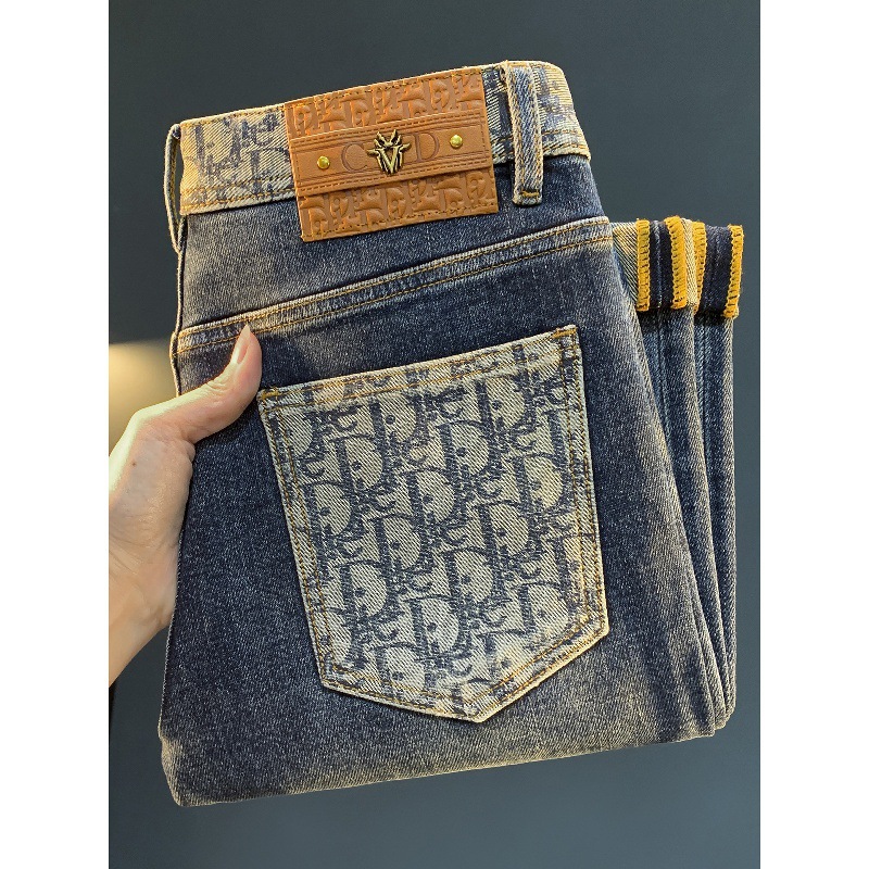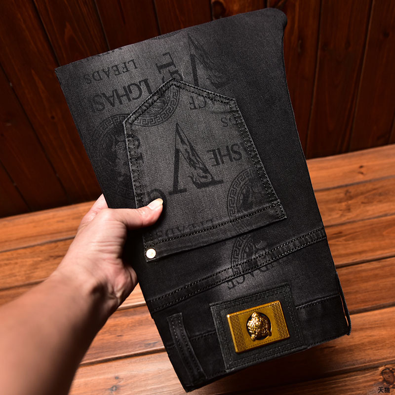 香港のトレンドブランド、高級プリントデニムパンツ、メンズ春秋新作、若者向けファッショナブルでスタイリッシュなトレンド、スリムフィットの細身ロングパンツ
