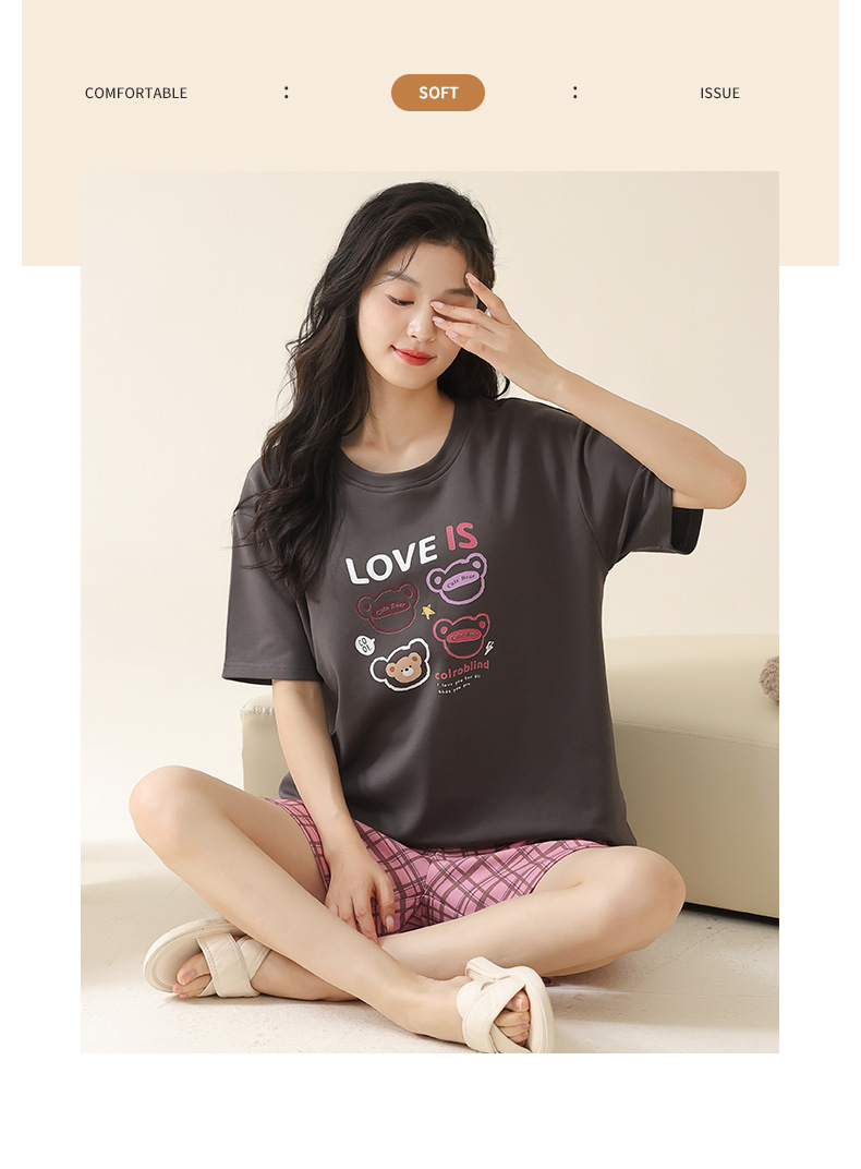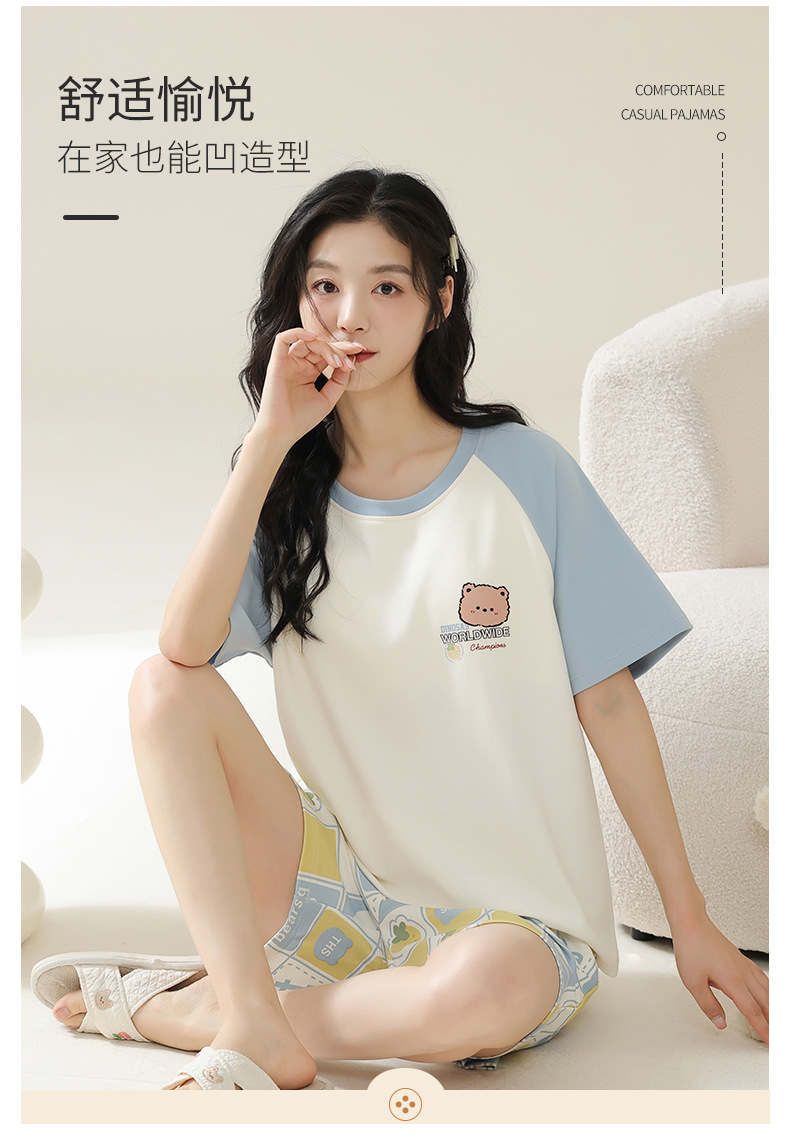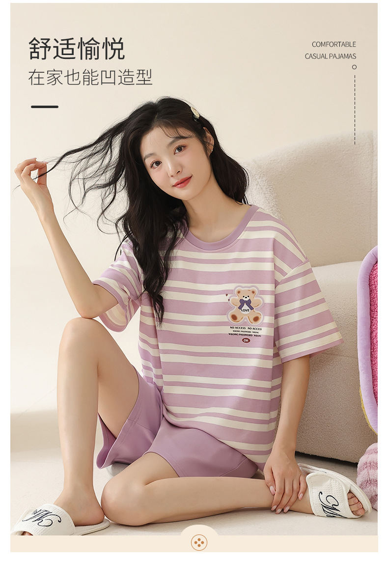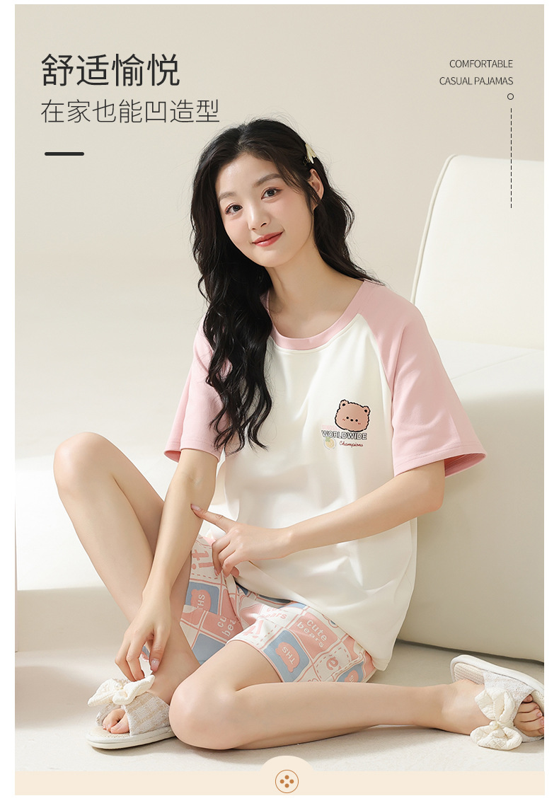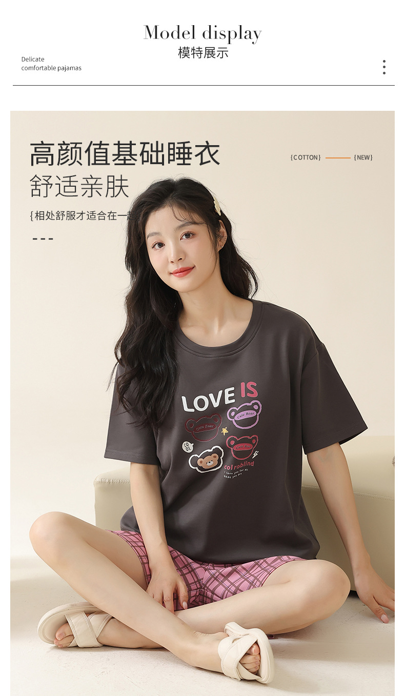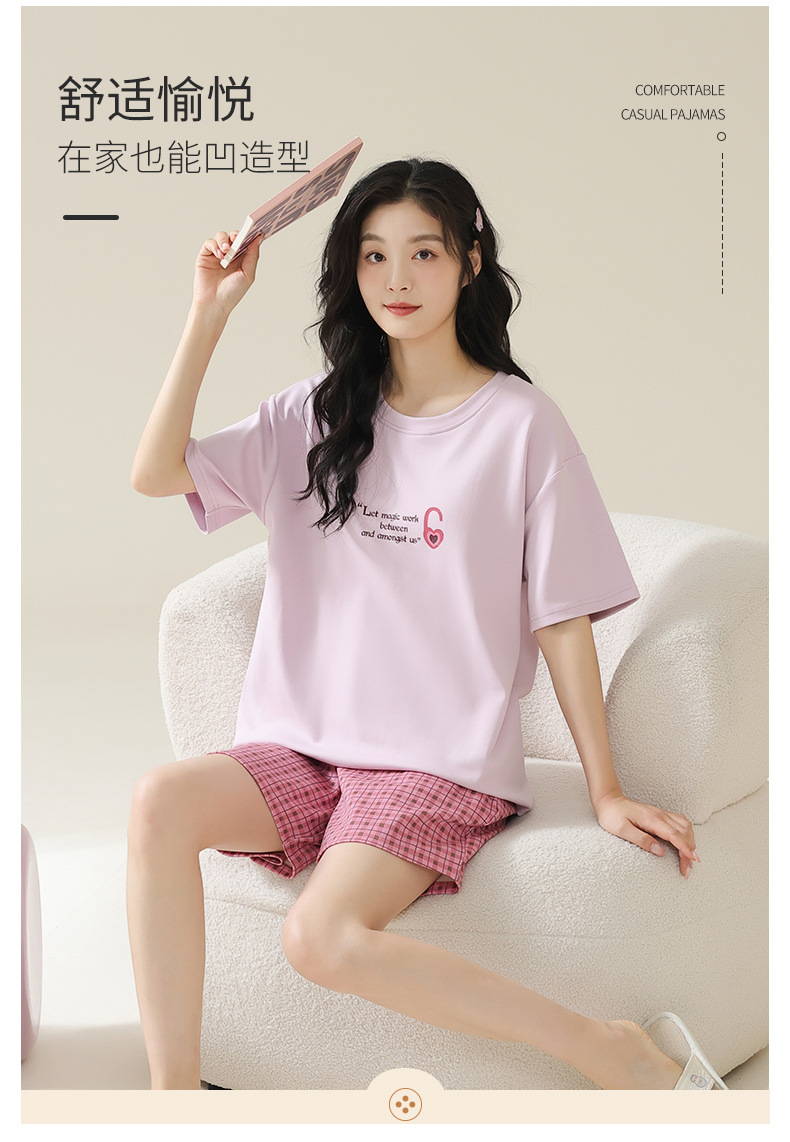 夏の純綿パジャマ女性の新しい丸首カジュアルサイズは、綿パジャマ半袖ホームウェアセットを着ることができます