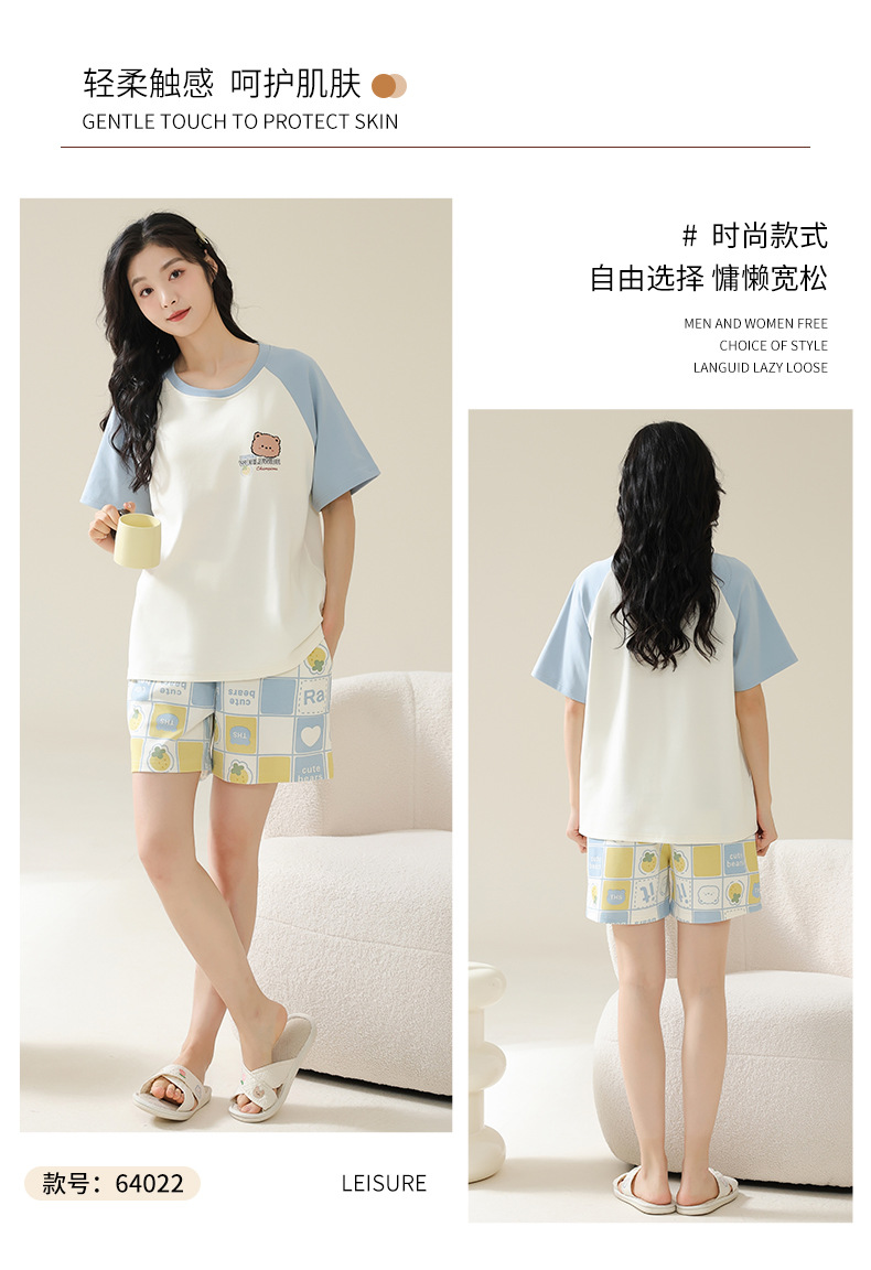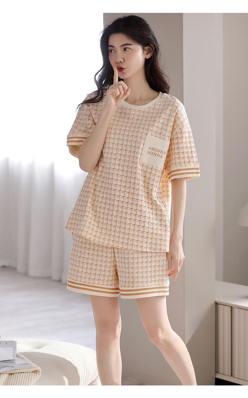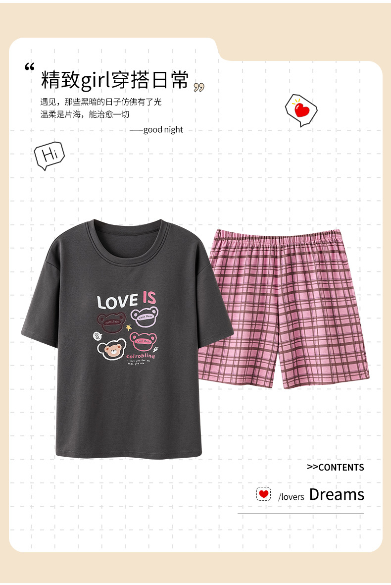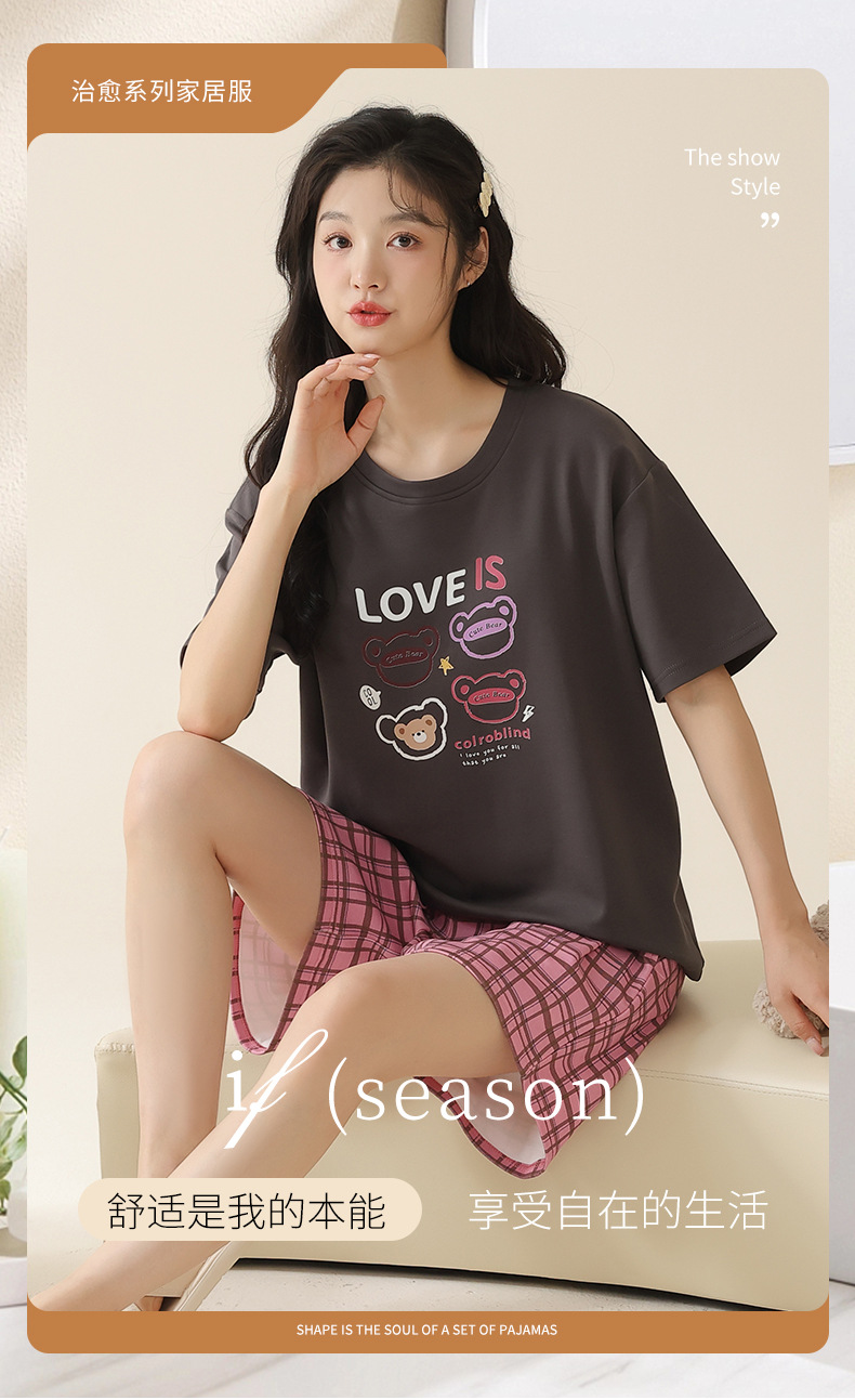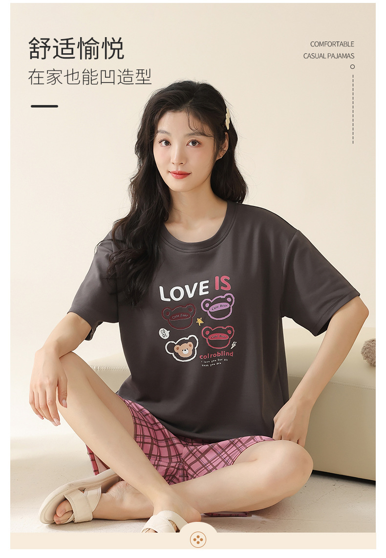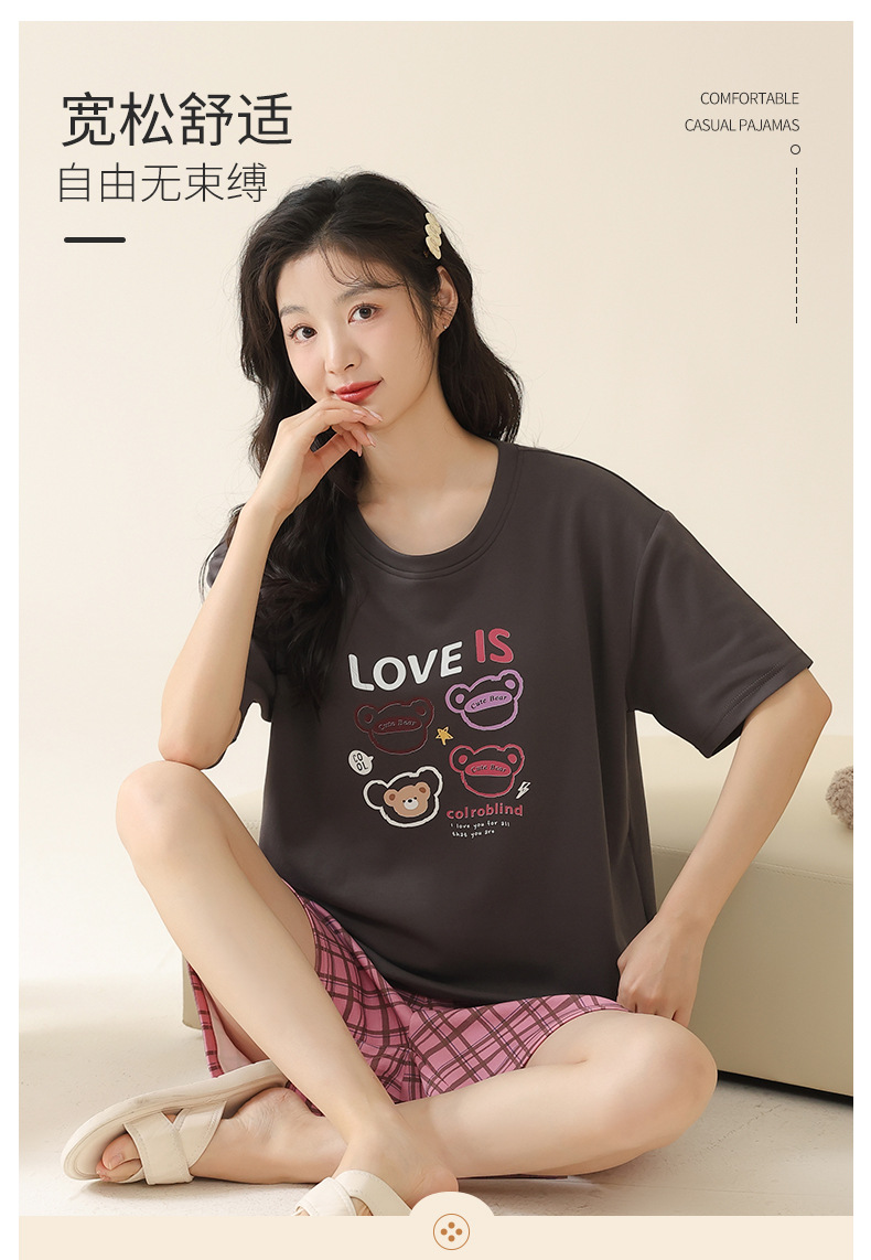 夏の純綿パジャマ女性の新しい丸首カジュアルサイズは、綿パジャマ半袖ホームウェアセットを着ることができます