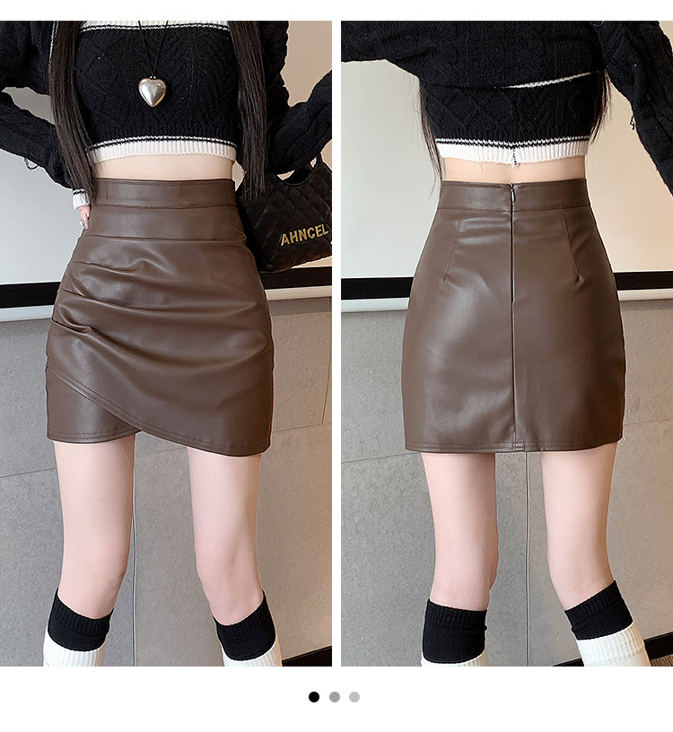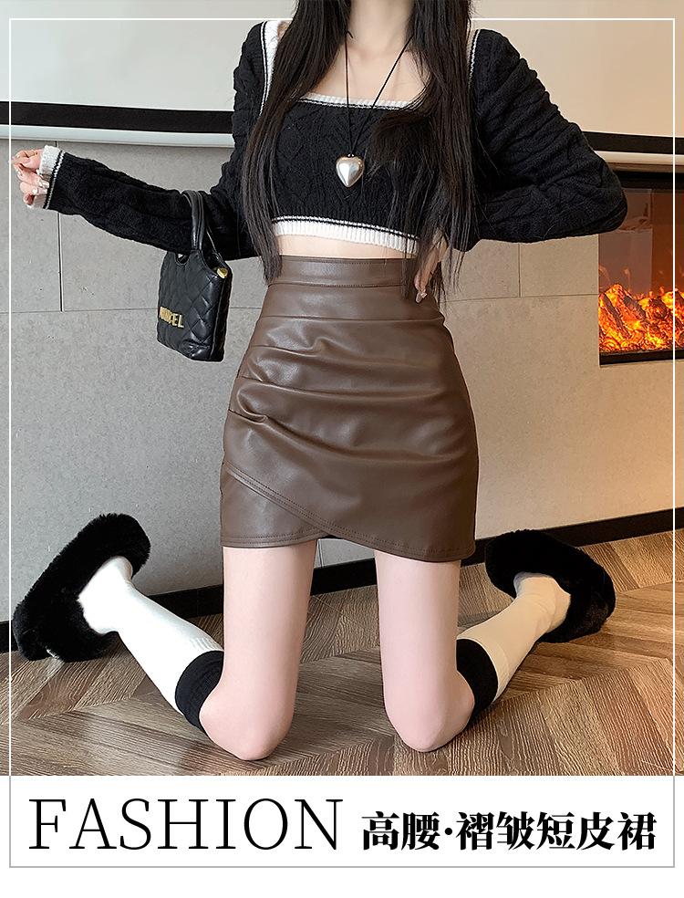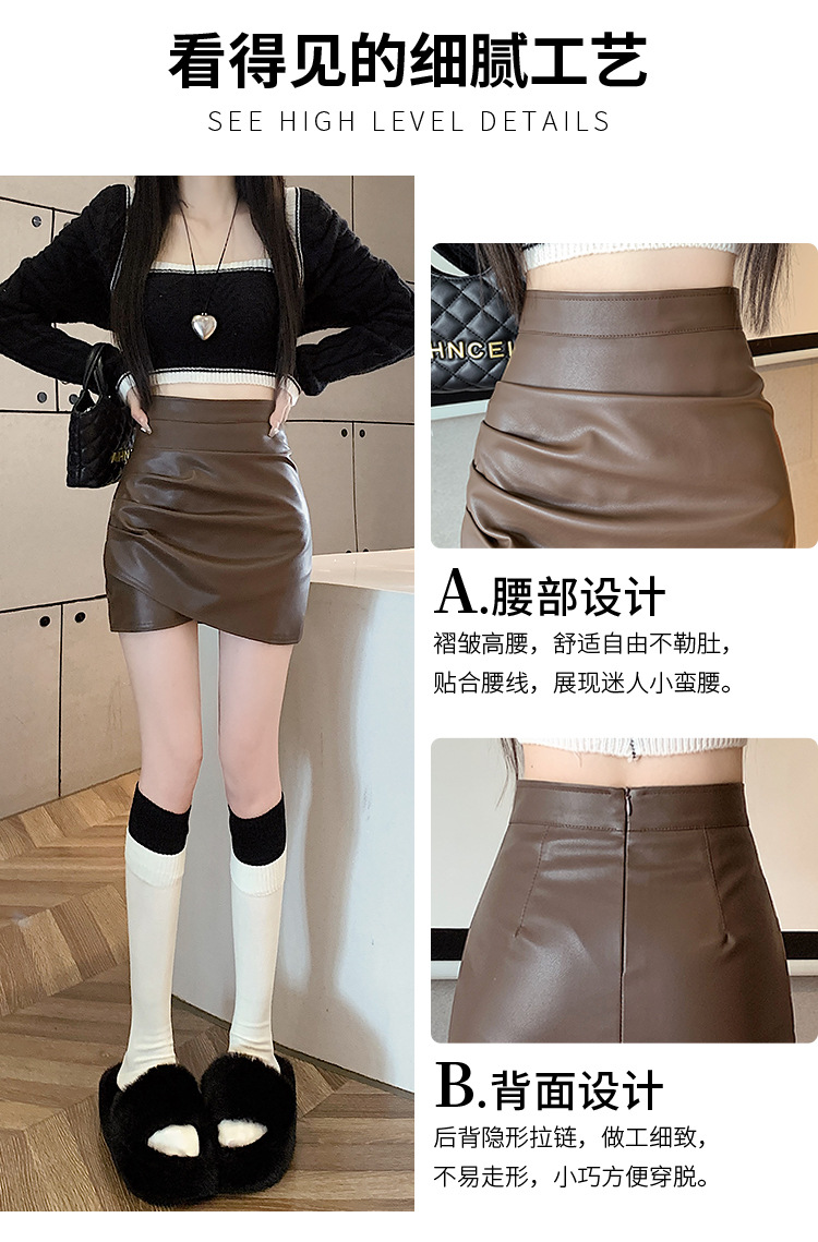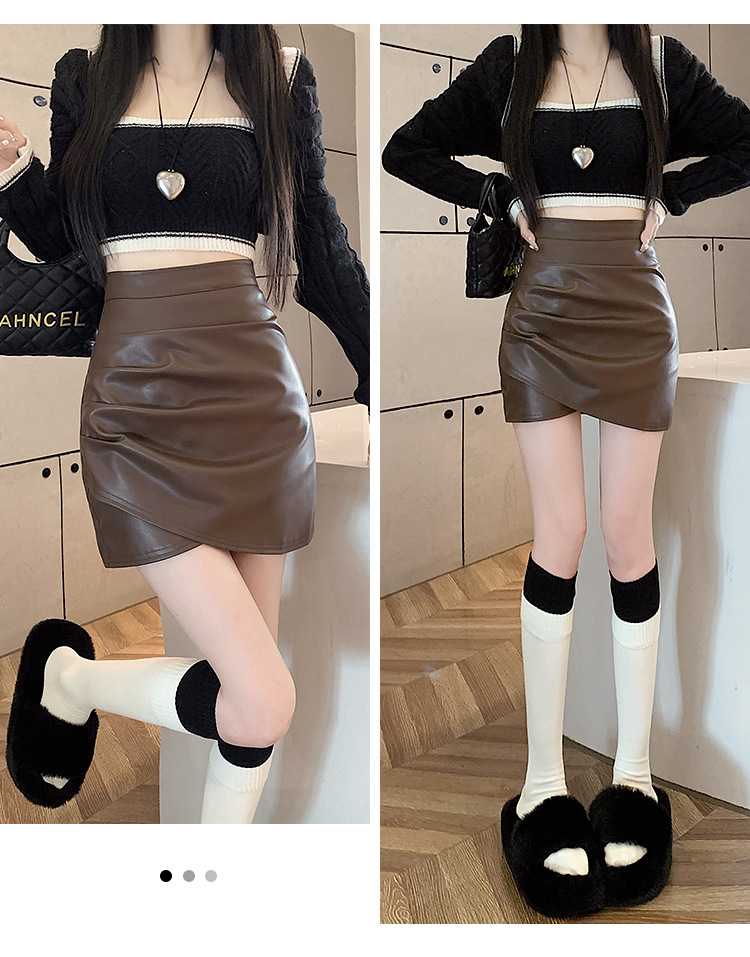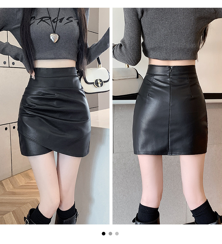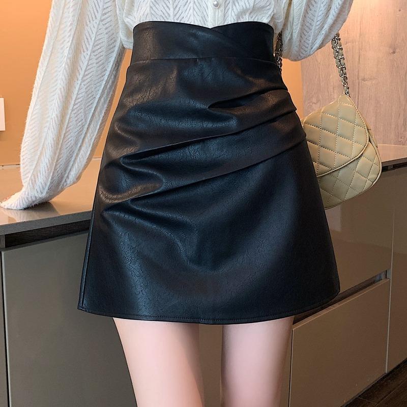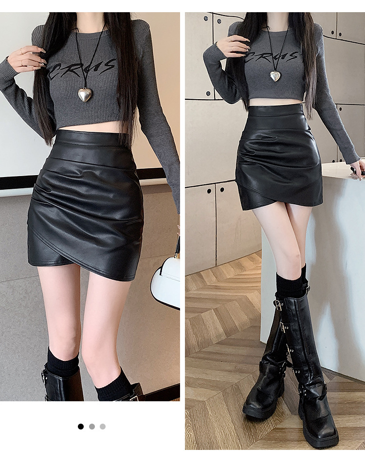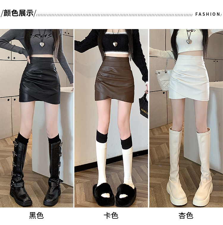 不規則なpu皮の半身のスカートの女性の2024新型の高い腰のしわのスカートはやせている気質の秋冬a字のヒップのスカートを現します。