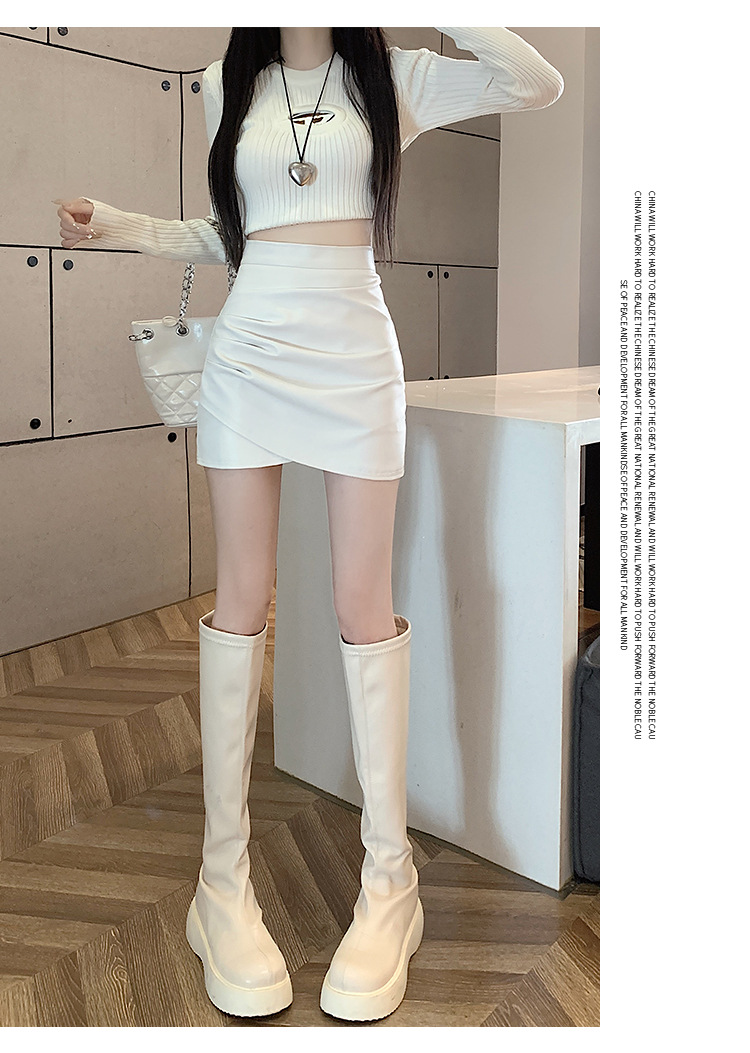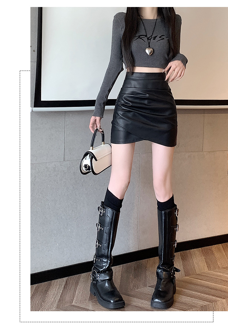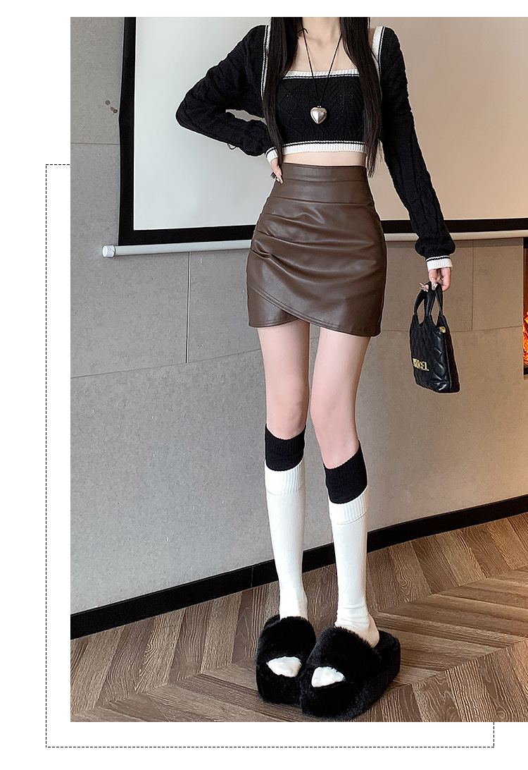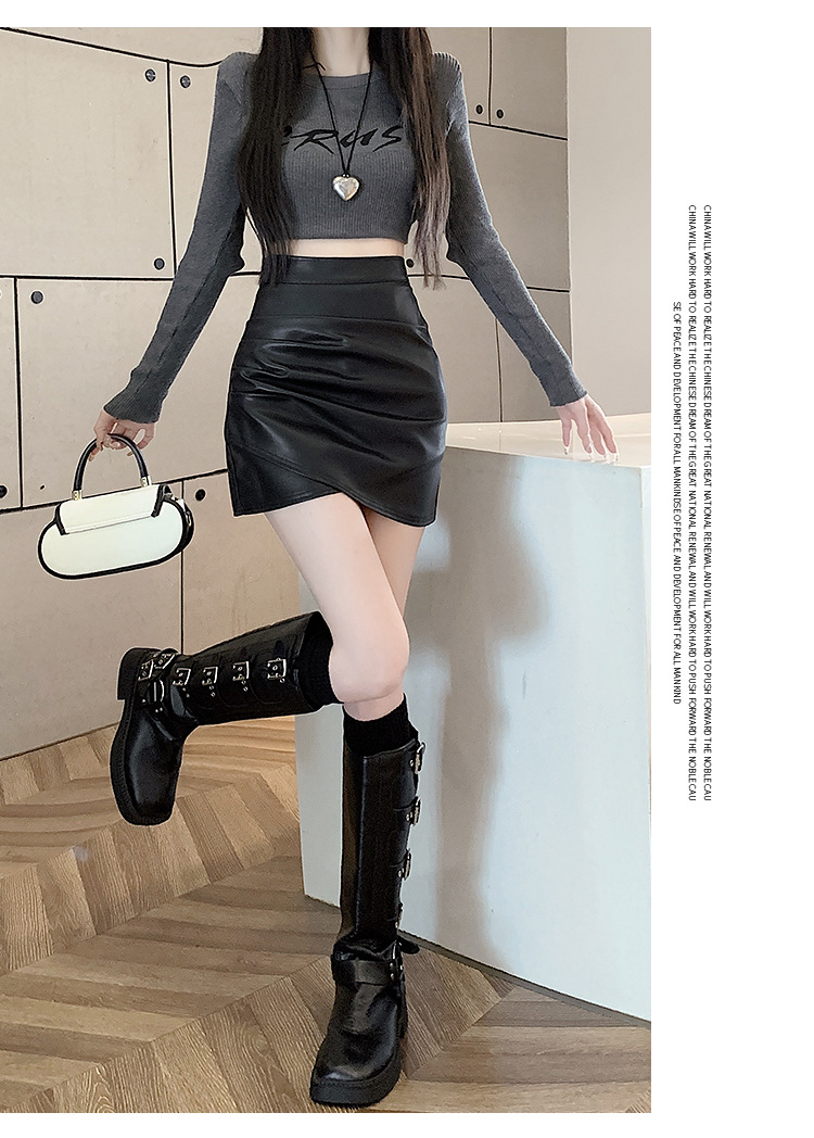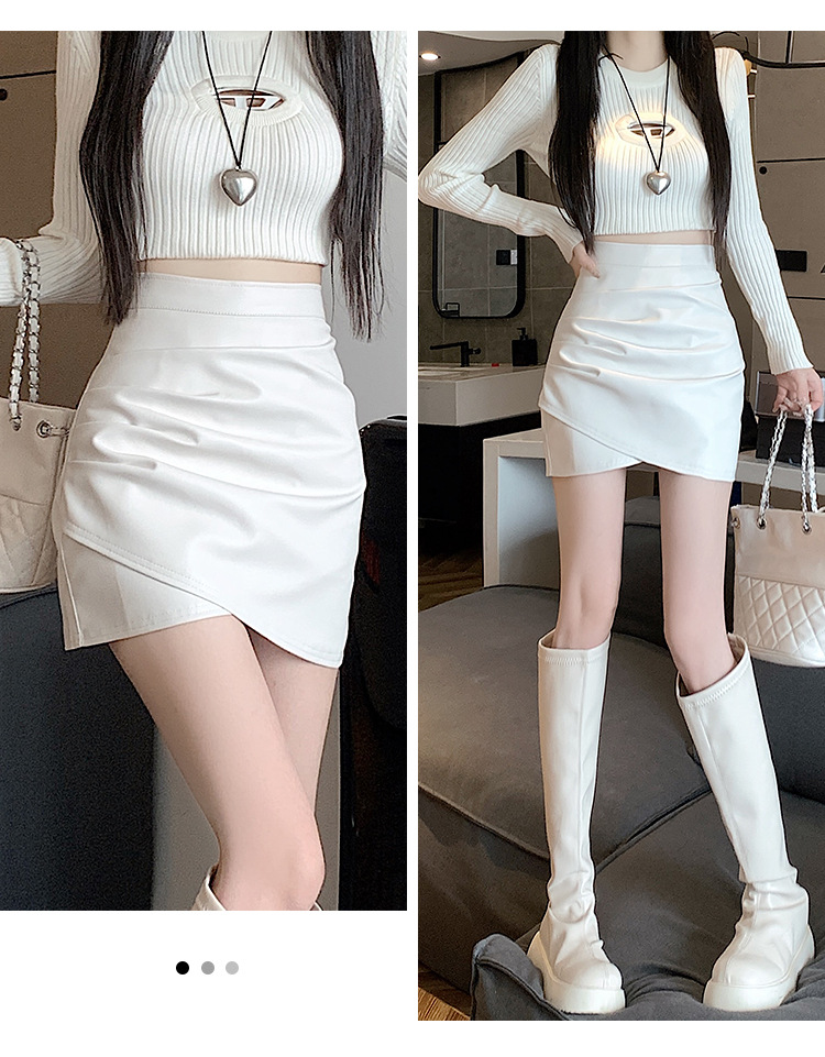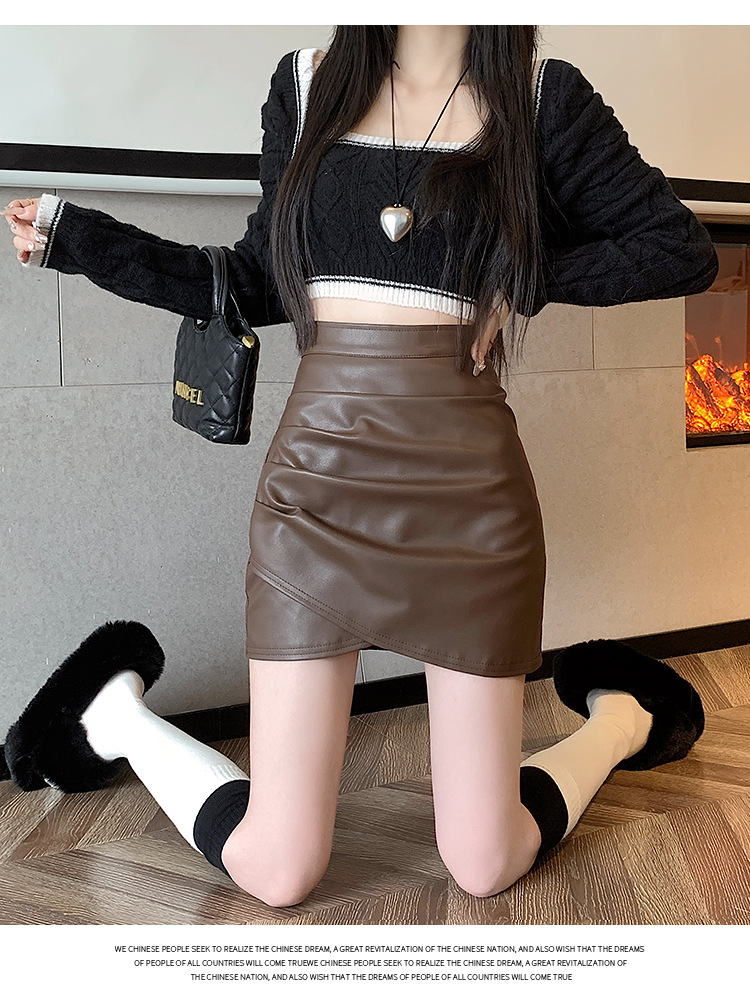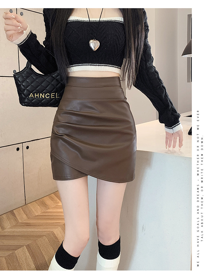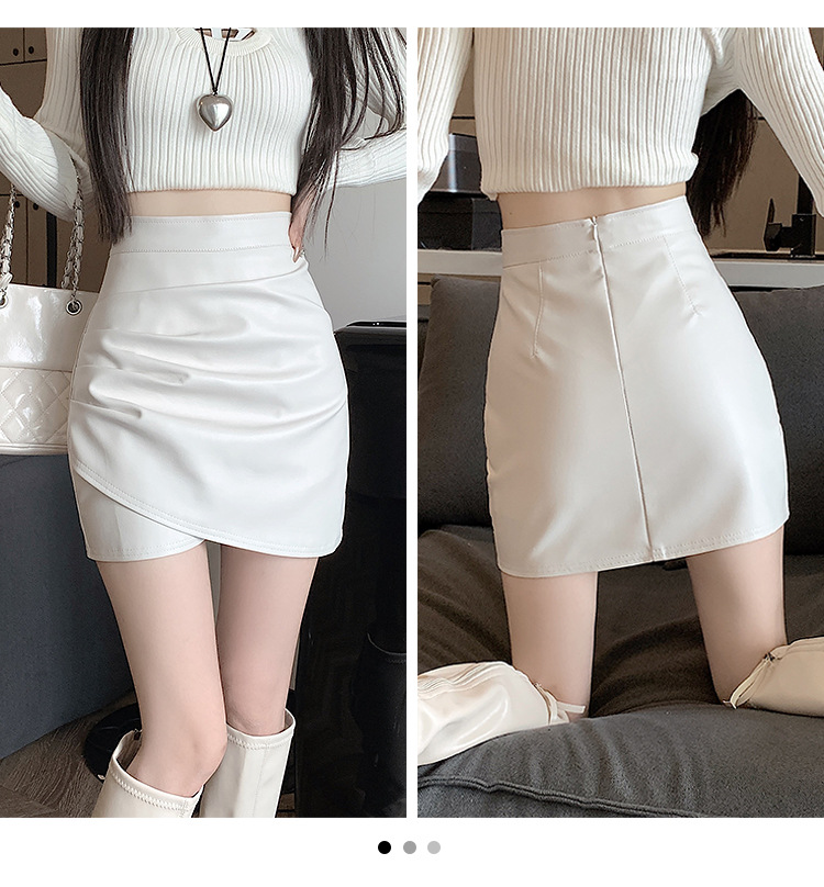 不規則なpu皮の半身のスカートの女性の2024新型の高い腰のしわのスカートはやせている気質の秋冬a字のヒップのスカートを現します。