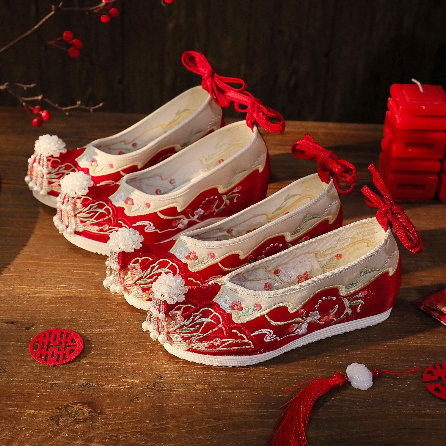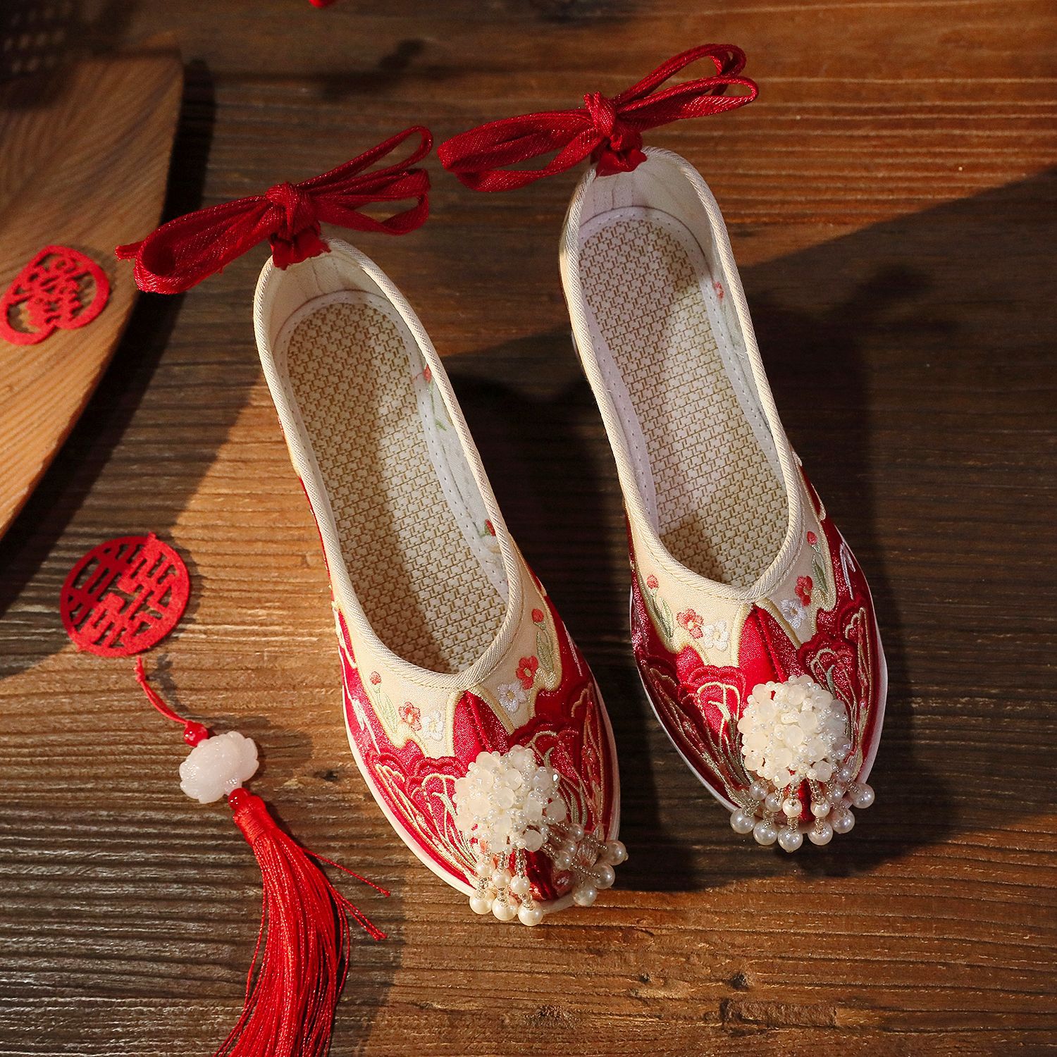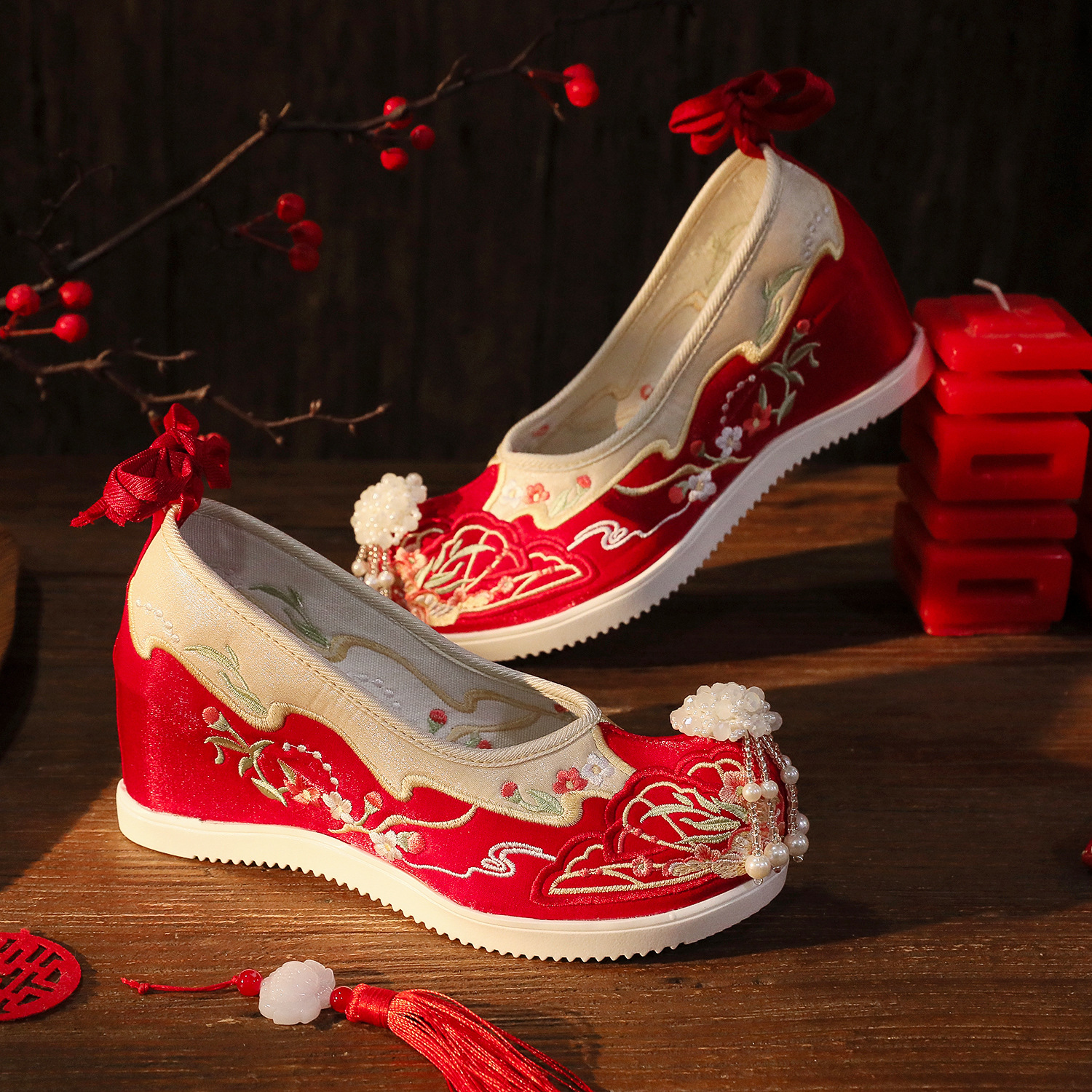 【蝶々花】春秋新作流蘇漢服靴古風刺繍靴新婦秀禾結婚靴中国式で高くなりました。