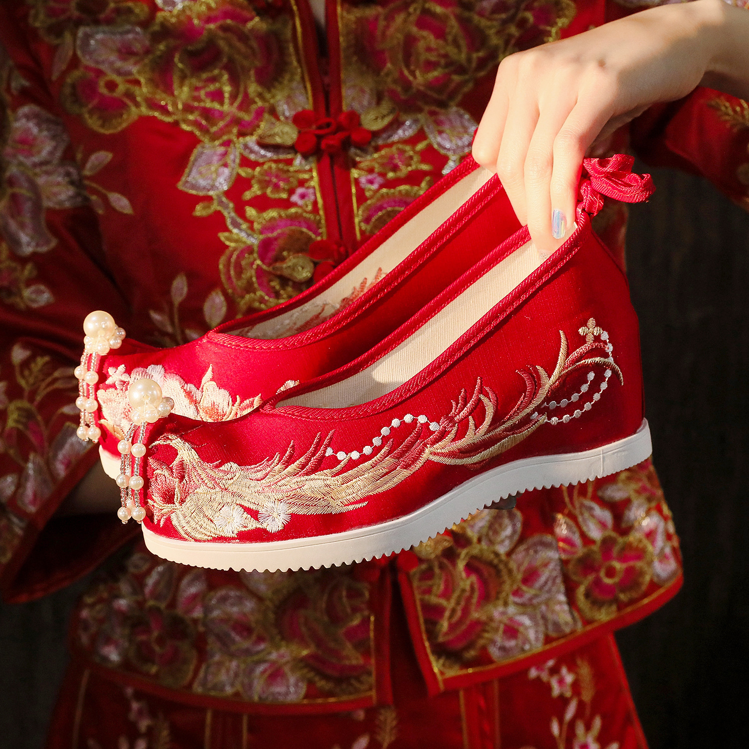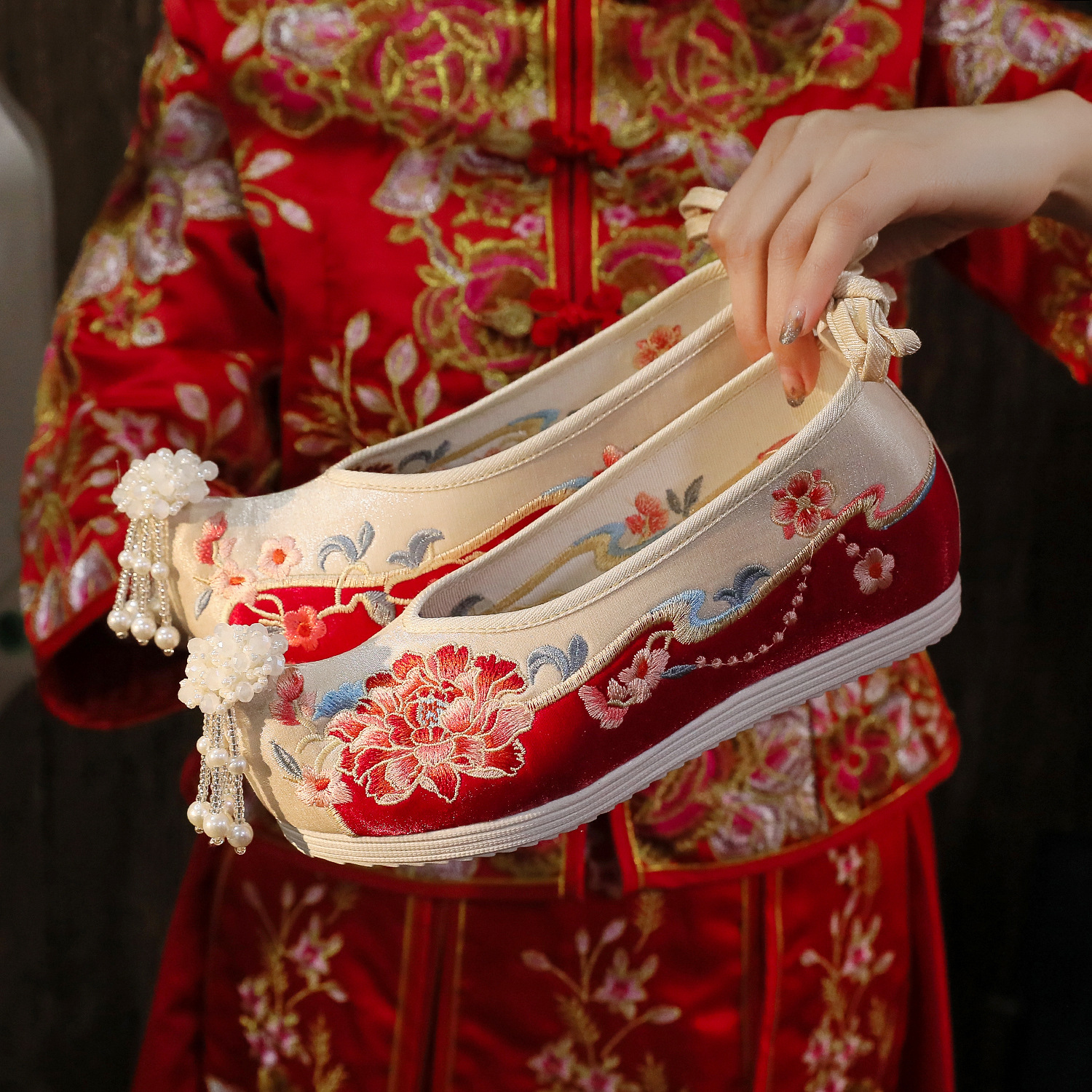 鳳来儀結婚靴古風靴秀禾唐装ビーズ刺繍靴赤い花嫁靴漢服結婚中国式公演