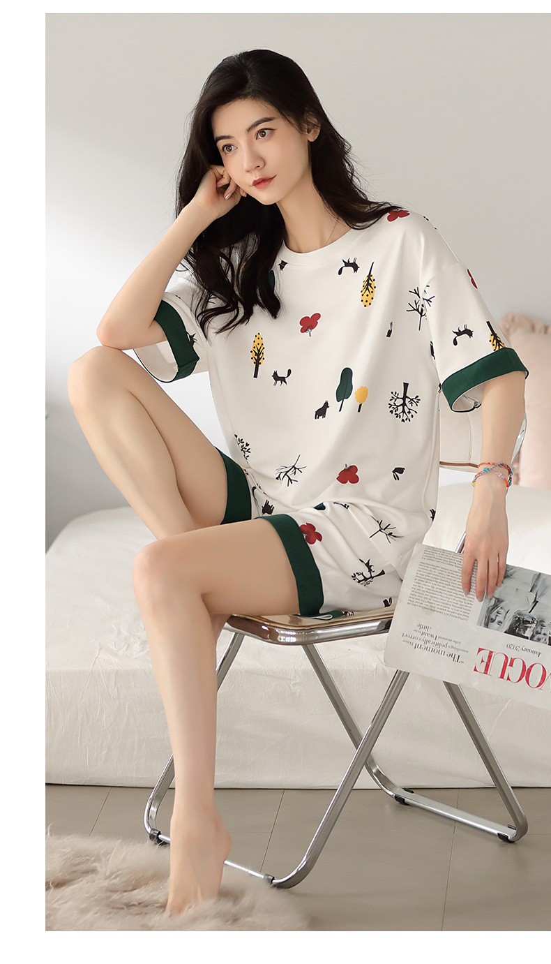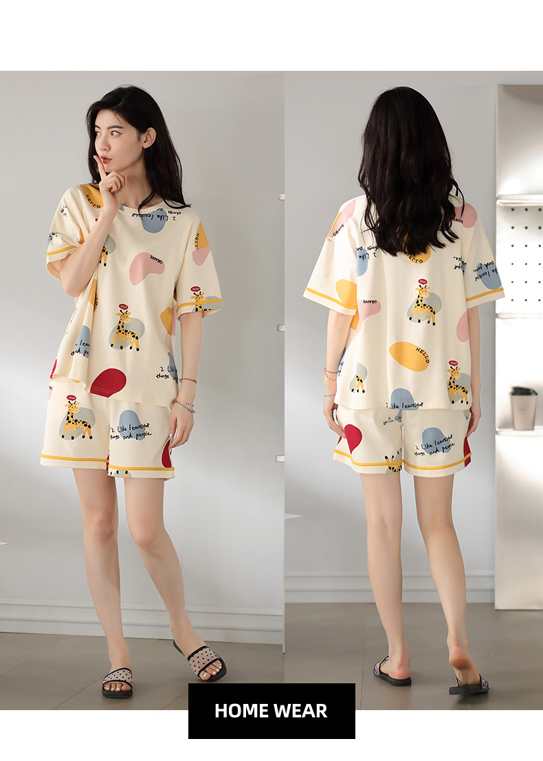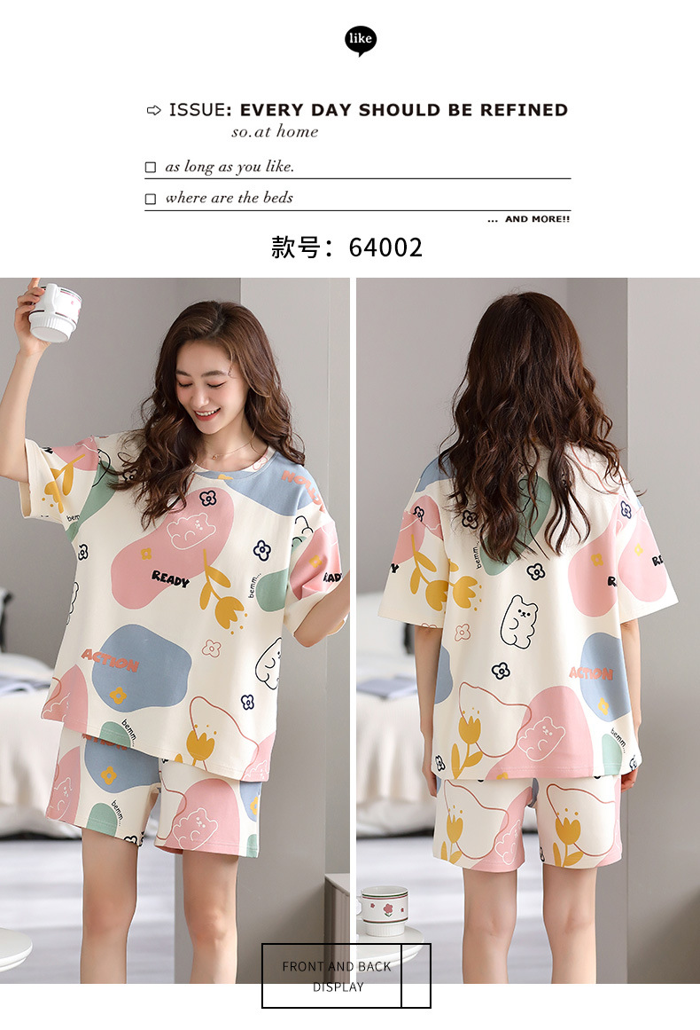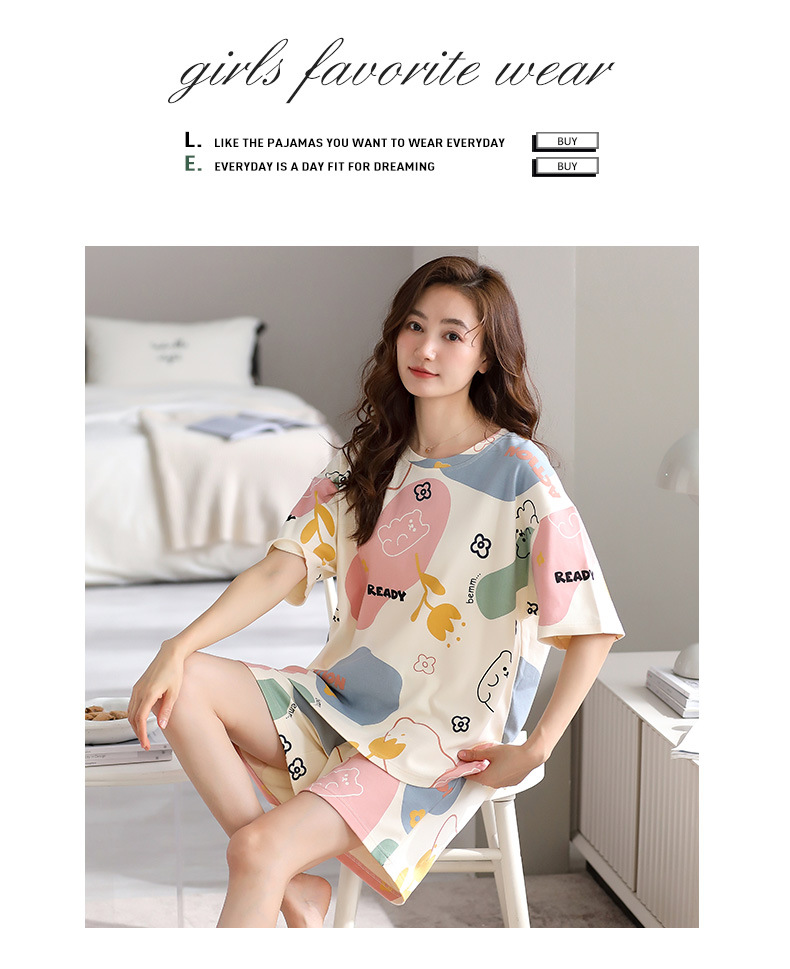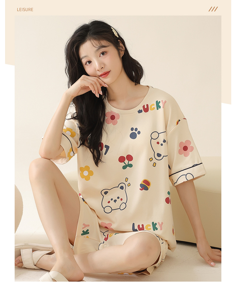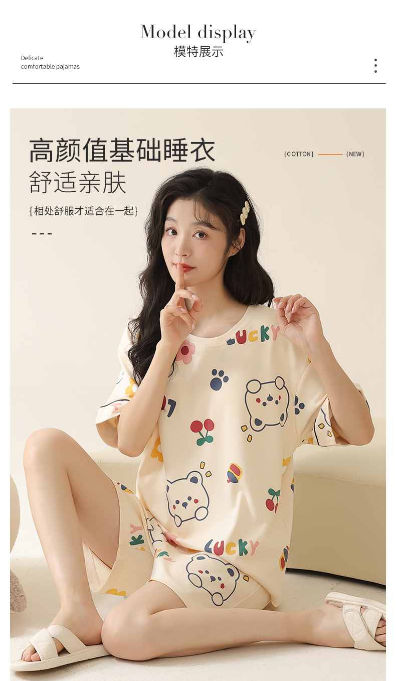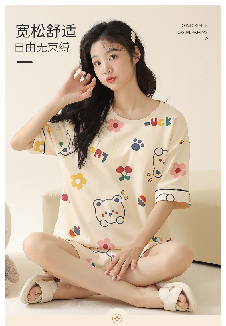 純綿パジャマ女性夏の薄い丸首漫画少女学生は半袖パジャマ綿の家庭服を着ることができる