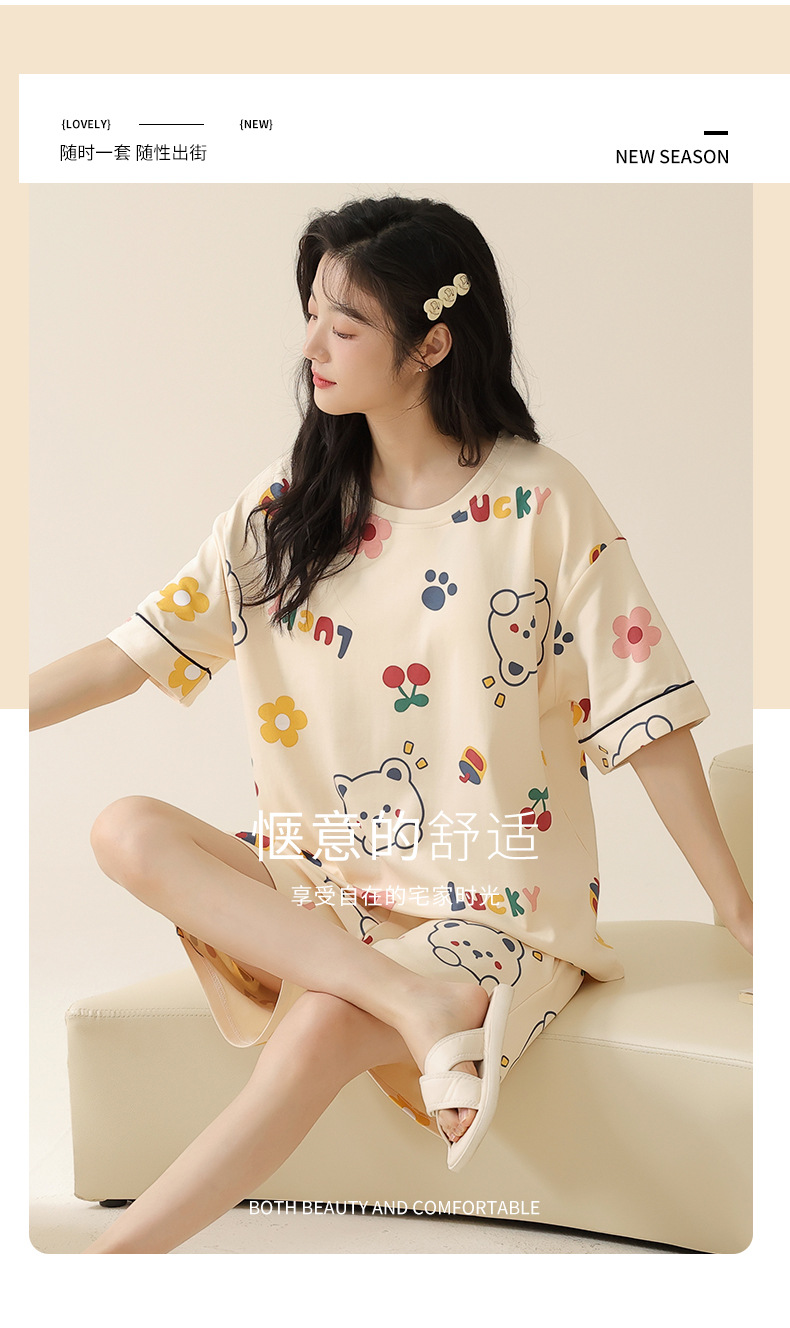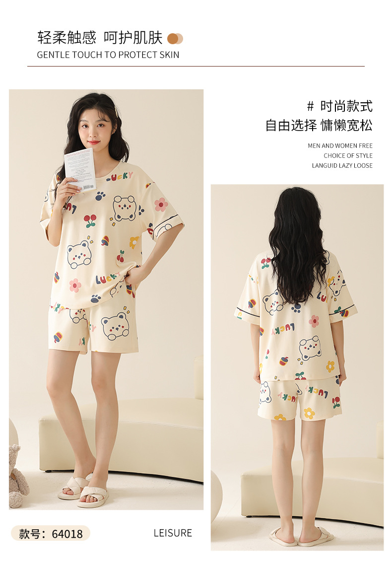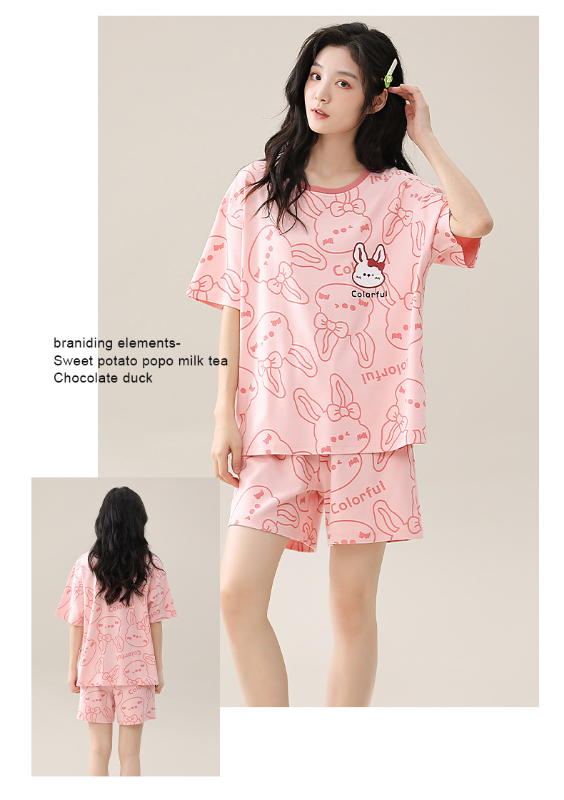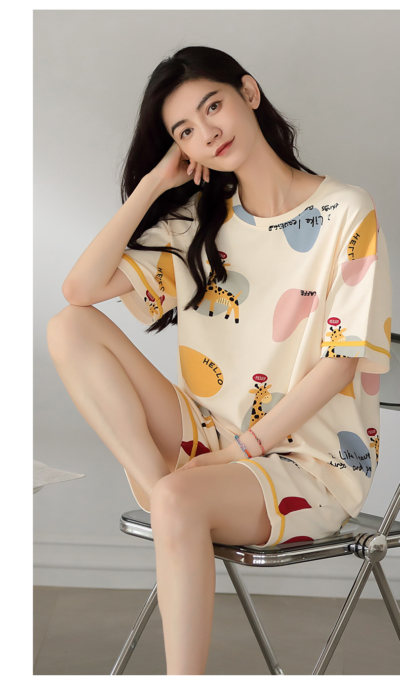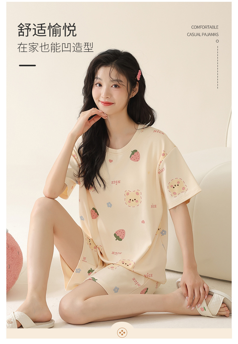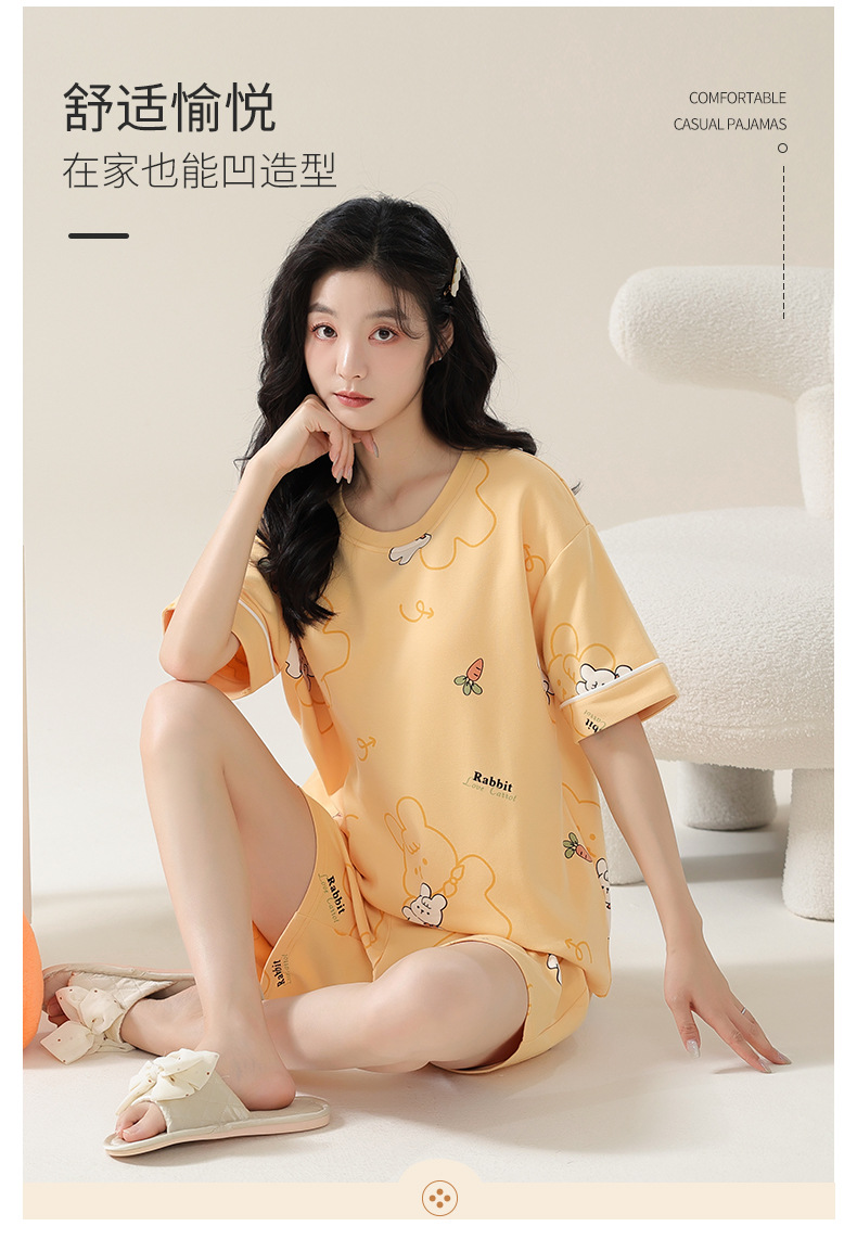 純綿パジャマ女性夏の薄い丸首漫画少女学生は半袖パジャマ綿の家庭服を着ることができる
