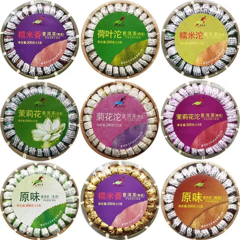 梱包仕様 もち米風味の熟茶,もち米の香りの生茶,ジャスミン熟茶,ジャスミンピーナッツティー,蓮の葉の熟茶,菊熟茶,オリジナル熟茶,オリジナル生茶