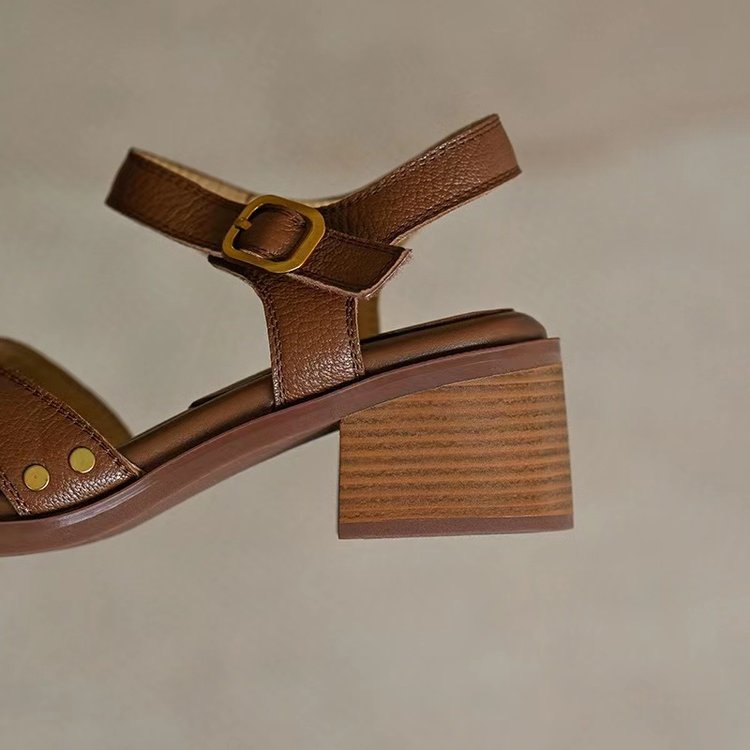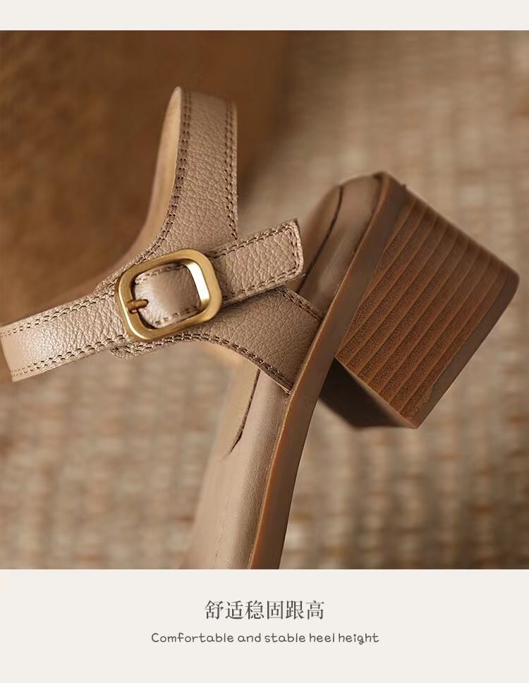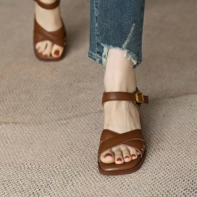 2024 夏の新レトロフレンチスタイル厚いヒールサンダル女性のオープントゥソフトレザーミッドヒールクロスローマの靴