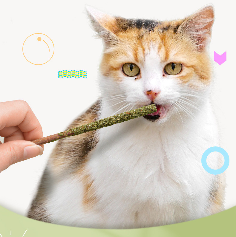 猫の歯磨き棒の歯磨き棒の幼い猫がかじって棒のミントの歯磨き棒の木の天のタデの棒をかじって猫のお菓子の用品をからかいます。