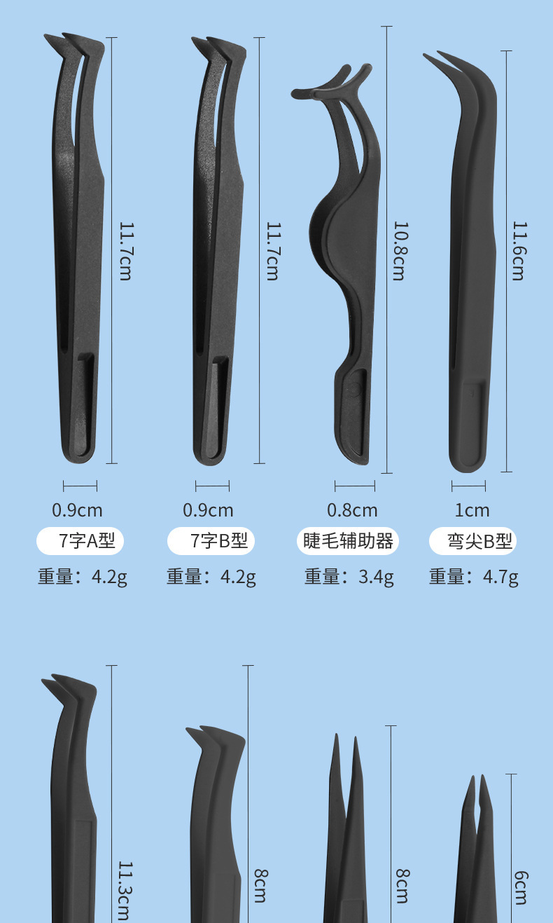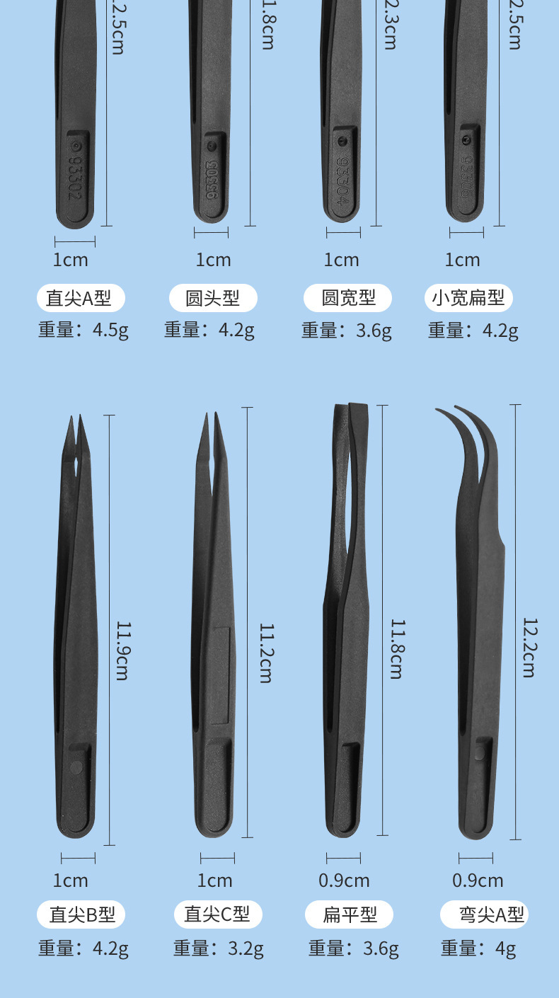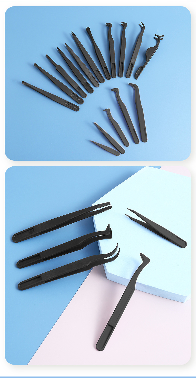 静電気防止黒色プラスチックABSピンセット工具プラスチックピンセット先平頭エルボ丸頭広口平頭