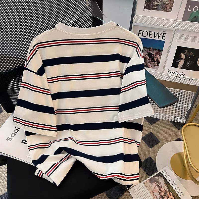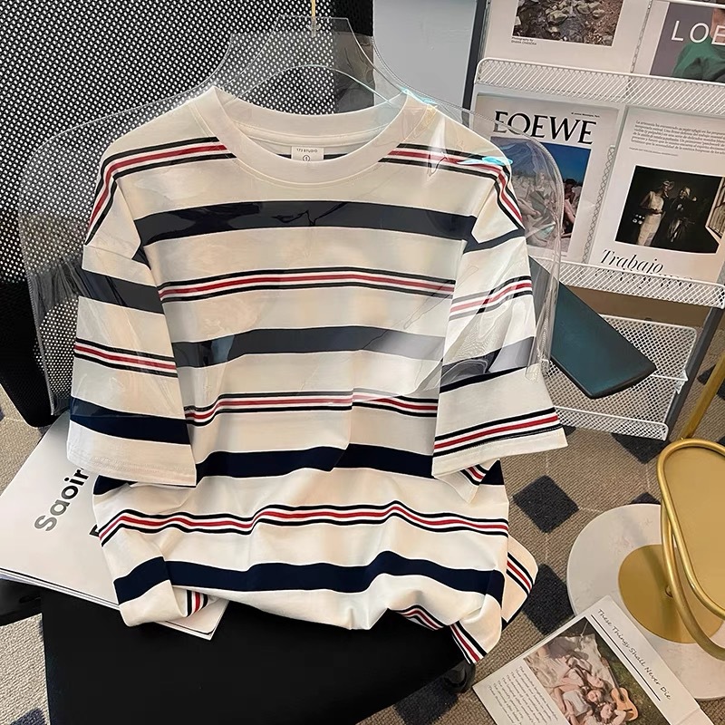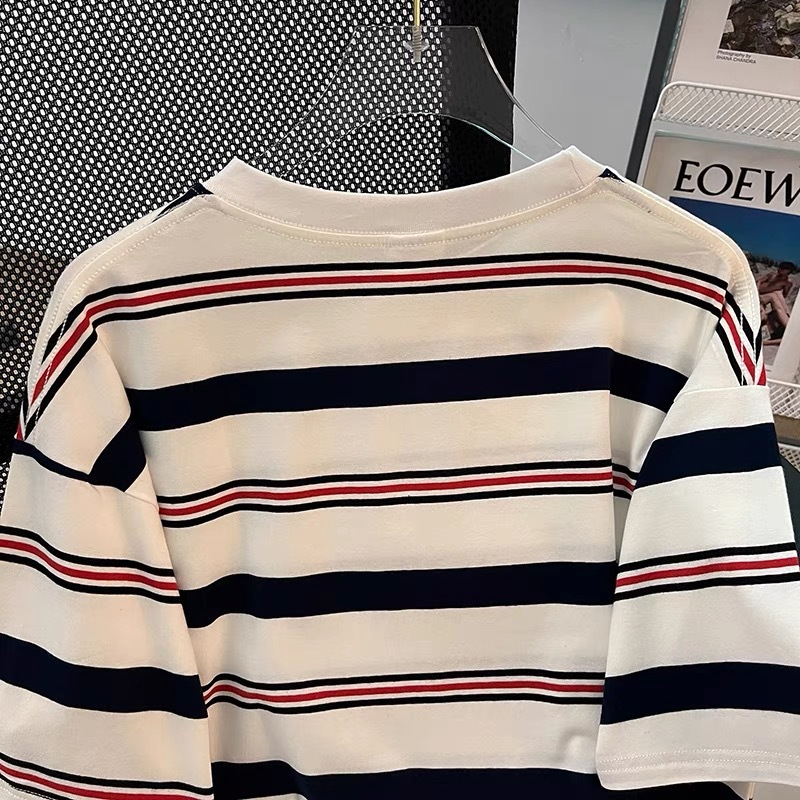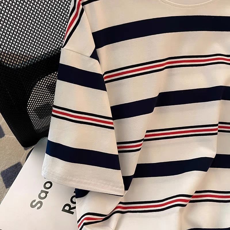 タイネット赤tシャツ女ins虹縞半袖上着2024年秋装韓国版ゆるい対外貿易シャツ