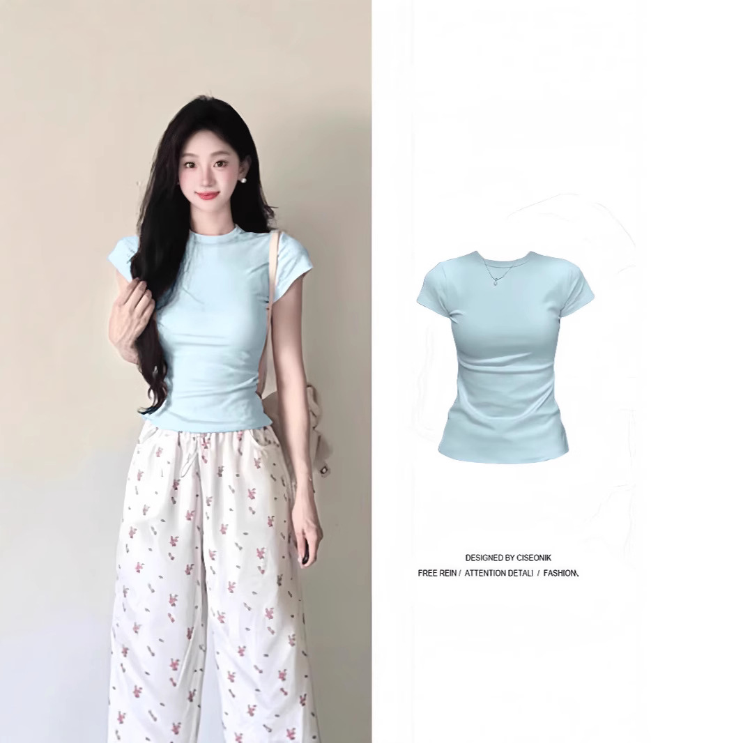 2025年夏新作、純粋な欲望系ハーフタートルネック半袖Tシャツ。女性用、スリムフィットで体型を美しく見せるインナーウェア、学生向けトップス、インスタ映え。
