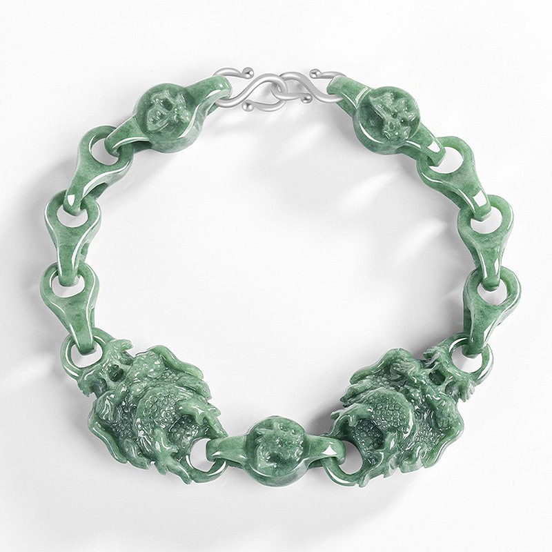 天然A货翡翠豆绿霸气双龙环环相扣手链冰种玉石手串男款四会玉器