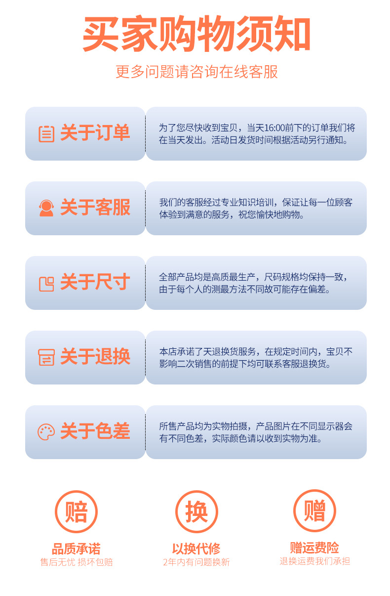 关于退换货:退货条件--产品本身的质量问题导致产品本身应有的功能缺失或达不到正常标准,在未经使用产品不影响二次销售情况下,可申请该产品换同等价值的产品。调货或退货应于收货签单之时起的24小时内申请,并于申请之时起24小时内寄回,时间以买家发货物流单/快递单扫描时间为准,过期本公司有权不办理退货换货。其他如销量不好、没有想象中好...等非产品本身质量问题的原因,我们将不提供退换货哦。