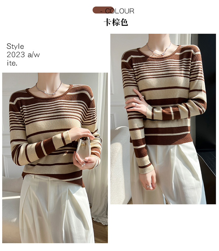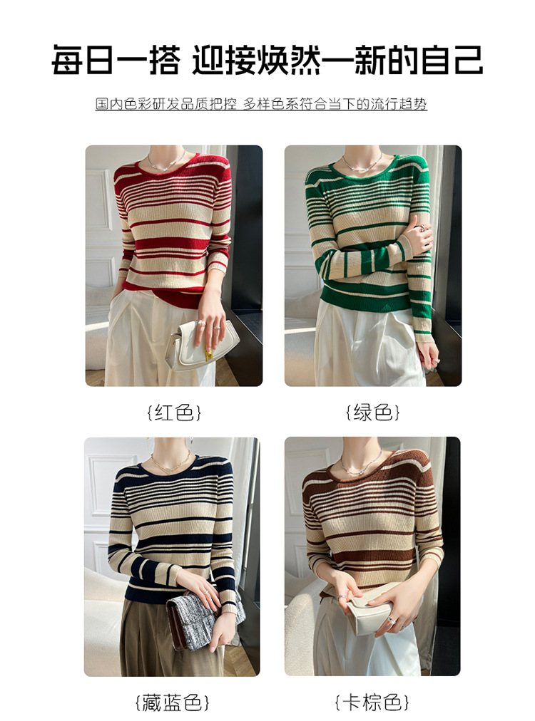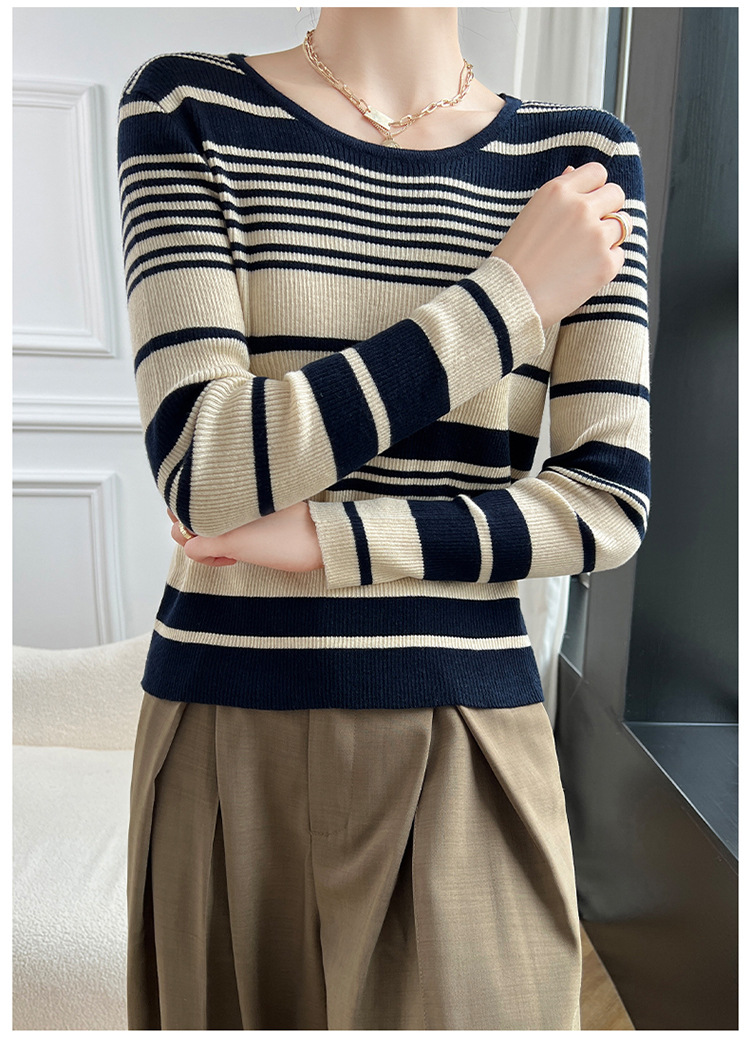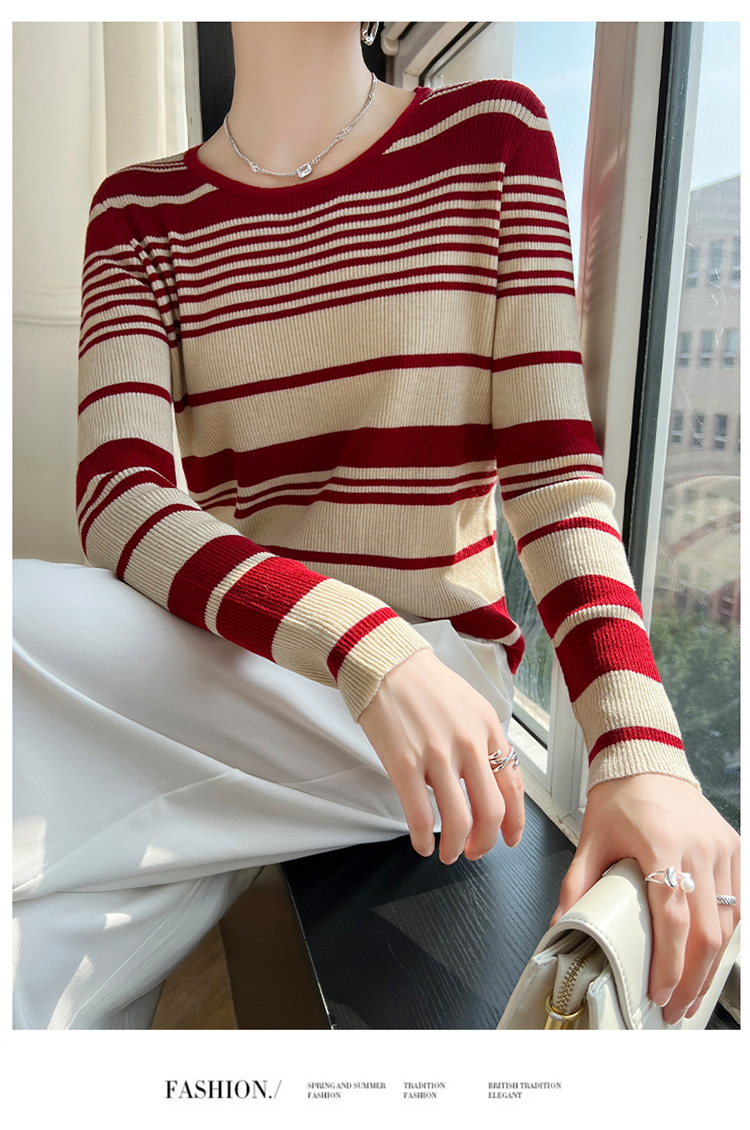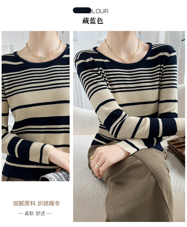 スリムストライプの丸首のニットの春の色合わせのセーターの女性の気質のプルオーバーの短い上着の底のシャツ
