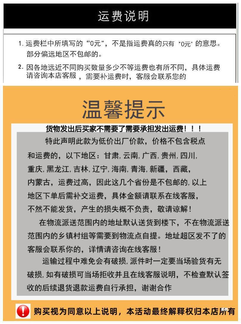 本店如有侵权在上货期间用了亲的图片,麻烦请通知联系客服!这边下架删除!先谢过了!由于本店商品种类丰富,难免会出现库存更新不及时的情况,麻烦拍下前咨询一下客服是否有货,偏远地区需要补邮费,具体邮费请咨询在线客服!自行拍下本店有权不发货,不便之处敬请见谅! 如需开票请各位亲提前联系客服沟通。